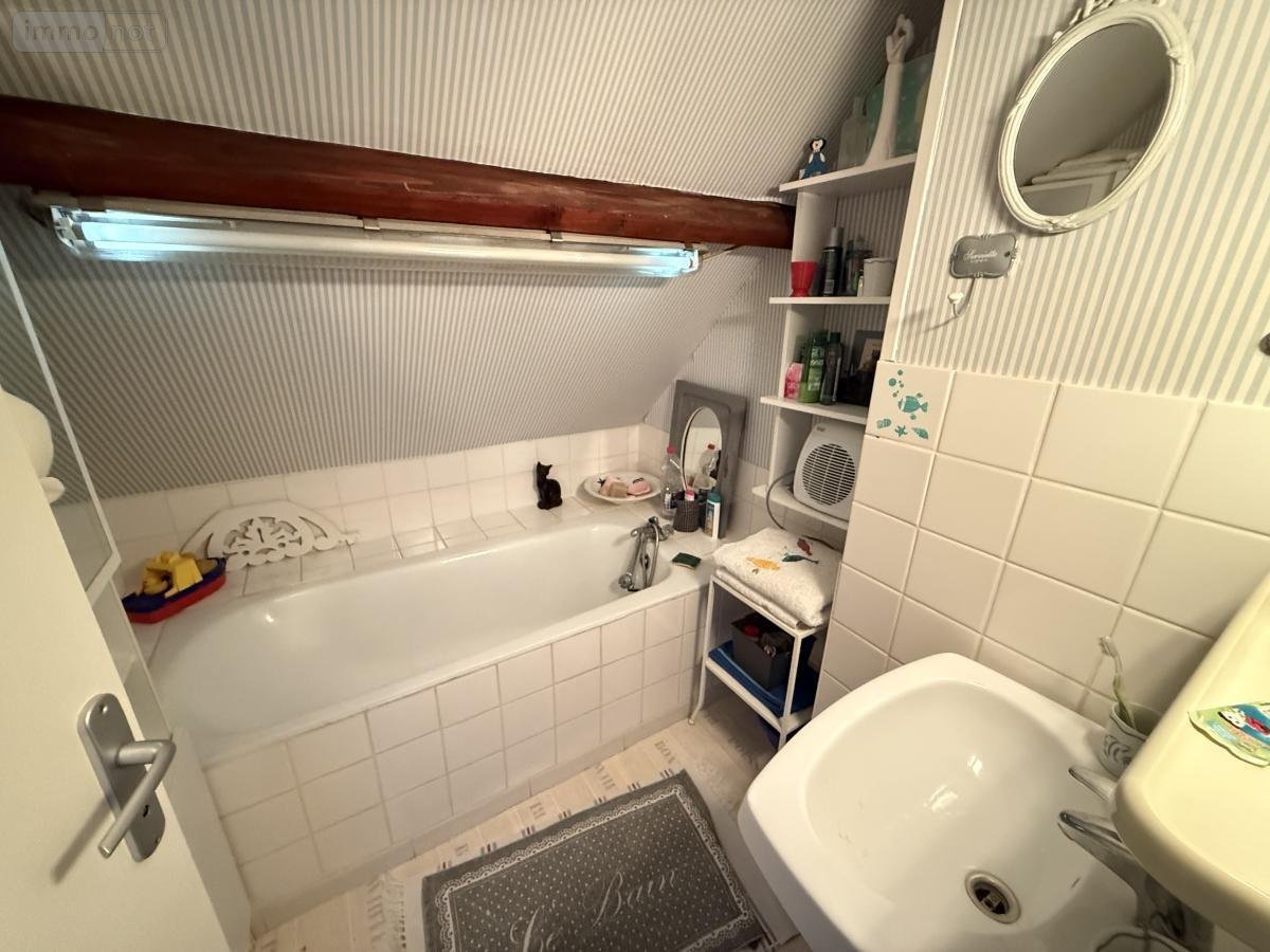 A l'étage un palier desservant deux chambres dont une passante, une salle de bains avec baignoire et vasque, WC de type sanibroyeur.