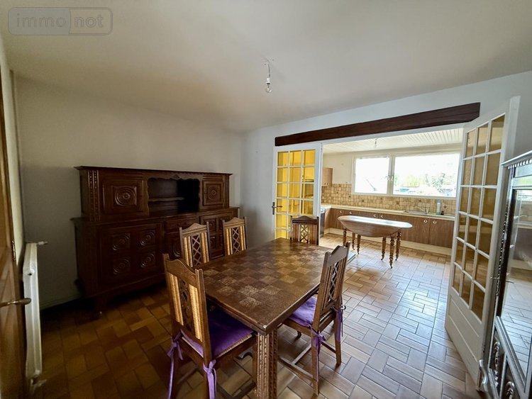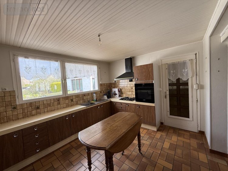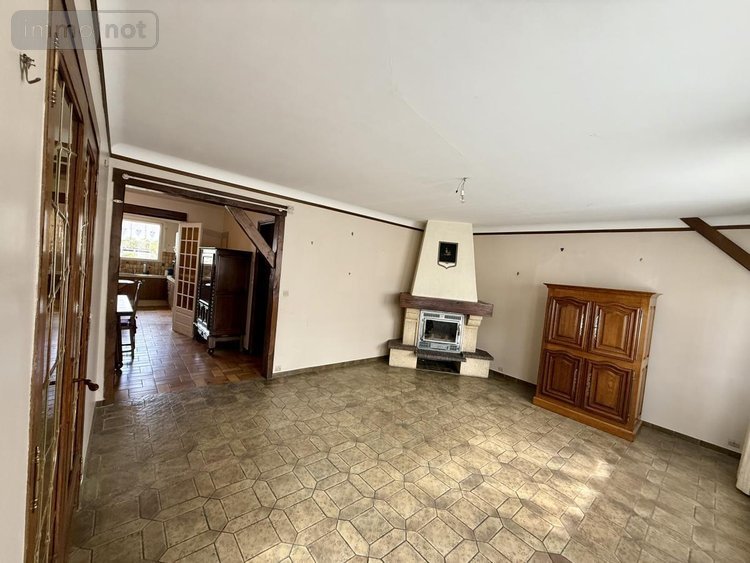Au rez-de-chaussée, un hall d'entrée avec accès à l'étage et à la cave, un salon avec insert bois, un séjour annexé à la cuisine, une cuisine aménagée et une salle d'eau avec vasque et placards + wc indépendant.