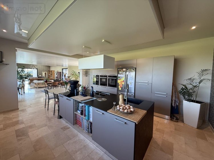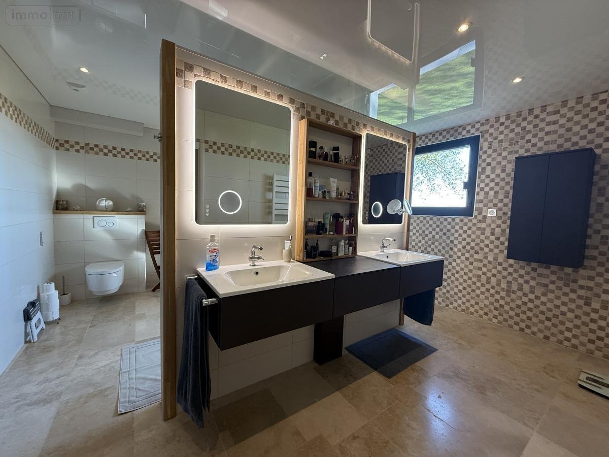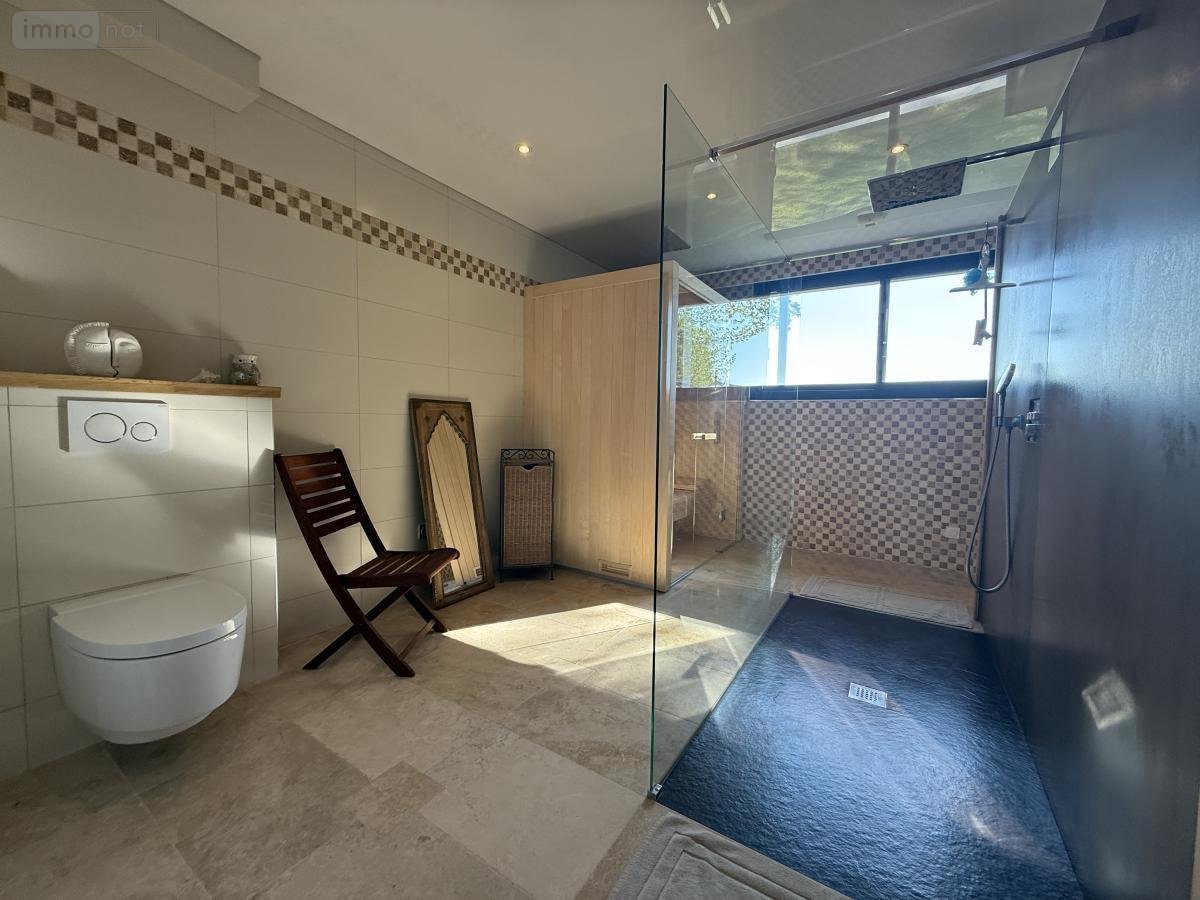 Dans le prolongement du hall, une chambre ou bureau (avec rangements, double poste de travail) avec accès direct sur le jardin, une cuisine moderne entièrement équipée avec espace repas, un séjour avec plafond tendu et son éclairage LED offrant un petit coin détente et un salon avec son insert bois pour les soirées d'hiver tout en profitant de la vue panoramique. Vous serez agréablement surpris par la vaste suite parentale avec son dressing indépendant, la salle d'eau avec sa douche italienne, son ensemble double vasques, wc et le must...un sauna.