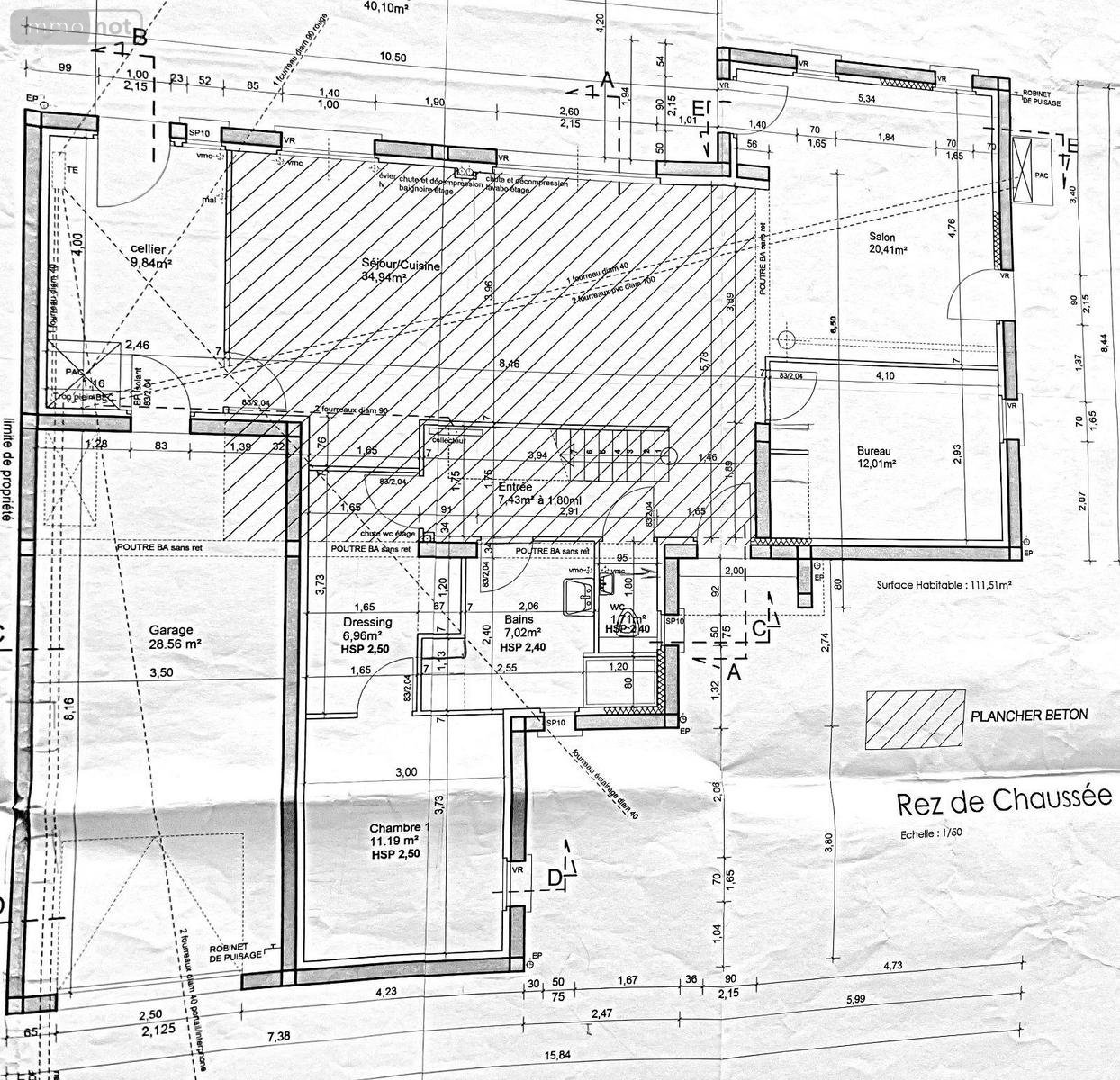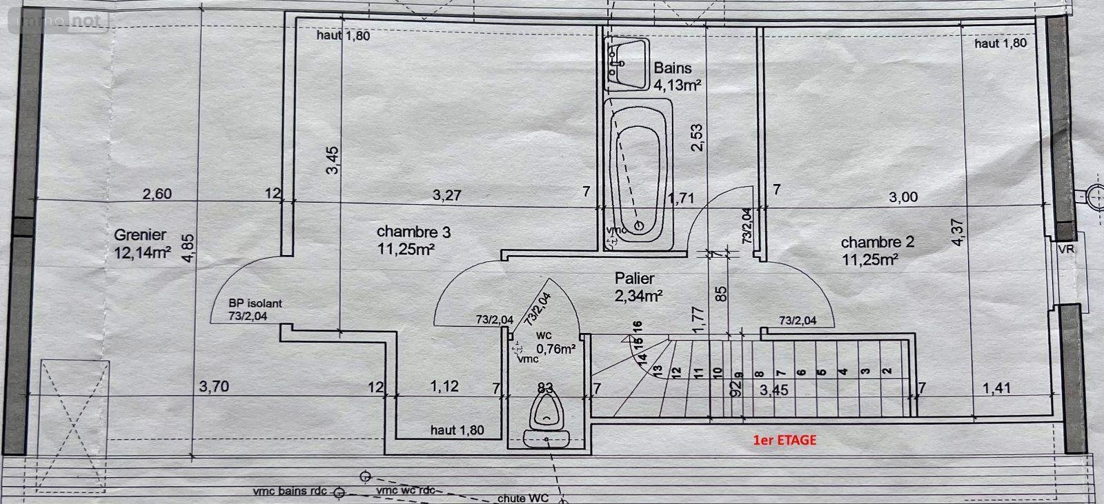 À l'étage sur plancher béton : 2 chambres, salle d'eau, WC, grenier aménageable.