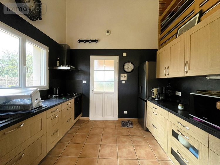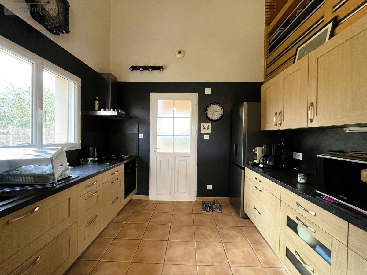 Au rez-de-chaussée, une cuisine aménagée et équipée dessert un salon-séjour lumineux avec poêle, ouvrant sur une terrasse carrelée exposée sud.