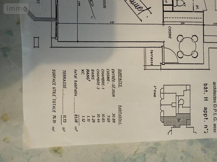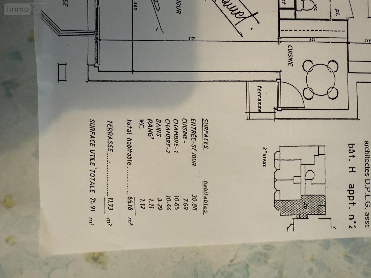 Appartement (65m²) de type 3 composé d'une entrée, d'un séjour avec balcon, deux chambres, dont une avec terrasse, salle de bains et wc.