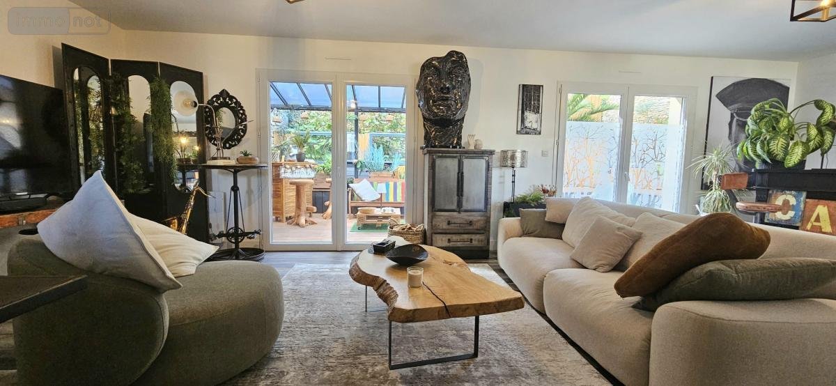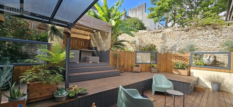 À l'arrière, un jardin intime s'organise autour d'une terrasse d'environ 57 m², avec différents espaces de détente. Un véritable espace de vie supplémentaire en extérieur, idéal pour profiter du soleil, recevoir ou encore installer un jacuzzi.