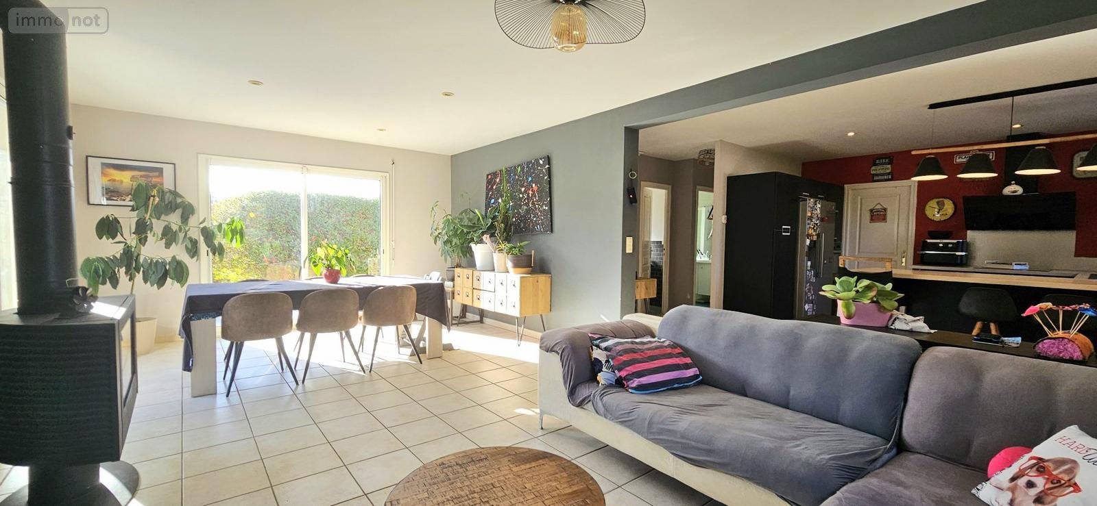 Entrée sur séjour double avec poêle à bois et 2 baies vitrées ouvrant sur la terrasse de 75m² exposée SUD-OUEST, cuisine ouverte aménagée et équipée, arrière cuisine buanderie et garage avec grenier au dessus.