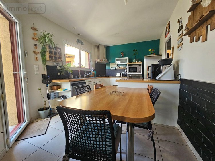 Cette maison est composée d'un vaste séjour-salon lumineux de 50m² avec poêle à bois. Cette pièce à vivre donne un accès direct à une cuisine ouverte aménagée et équipée attenant à une buanderie.