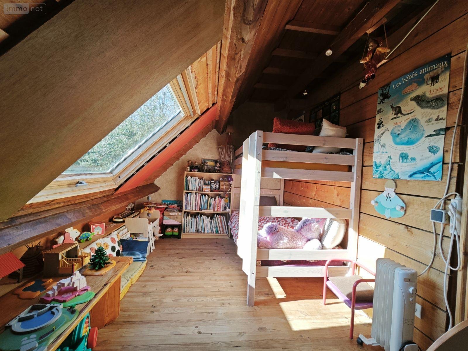 A l'étage un palier desservant avec coin nuit polyvalent, trois chambres dont deux avec un grenier mezzanine communiquant et une salle d'eau avec WC.