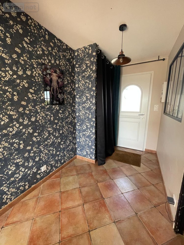Entrée ouverte sur grande pièce de vie avec poêle à bois et grande baie vitrée sur jardin. Cuisine équipée et aménagée ouverte par un passe plat sur le séjour.