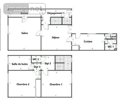 - à l'étage : palier, deux chambres, salle de bains, WC