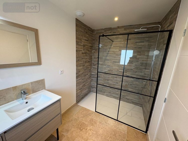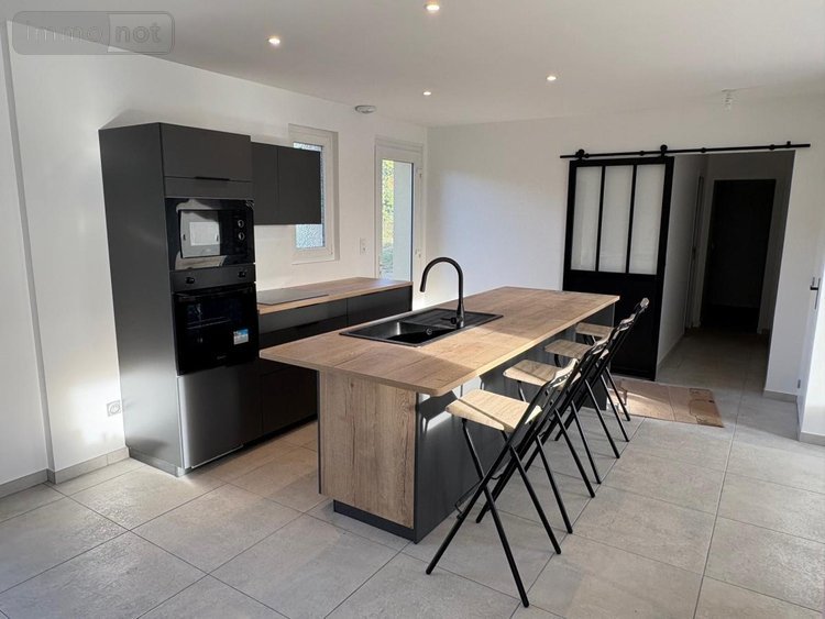 Entrée dans pièce de vie 50m² avec cuisine aménagée équipée ouverte toute neuve, dégagement, 3 chambres dont deux avec placards, salle d'eau avec grande douche à l'italienne, WC.