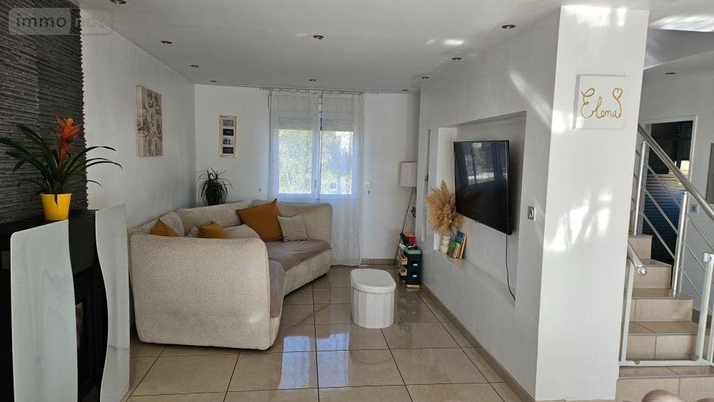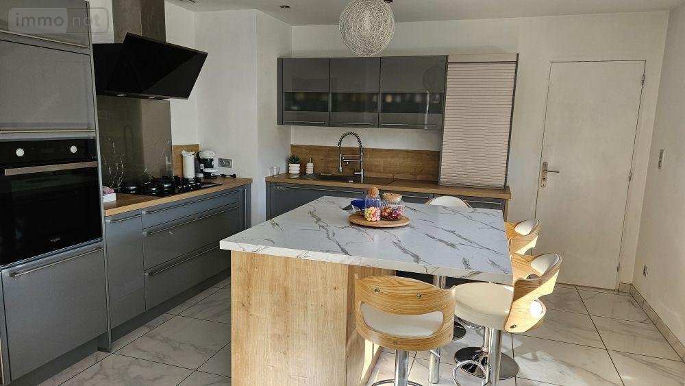 Maison d'une surface habitable de 150m2 composée de plain-pied d'une cuisine aménagée et équipée ouverte sur salon séjour avec poêle à granulés, une chambre et une salle d'eau avec wc, cellier, garage de 15m2. Un palier à l'étage desservant trois chambres et une salle de bain avec wc. Jardin aménagée.