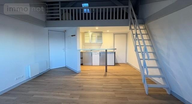 une pièce principal avec un coin cuisine équipée, une mezzanine, une chambre avec un placard et une salle d'eau attenante avec un WC.