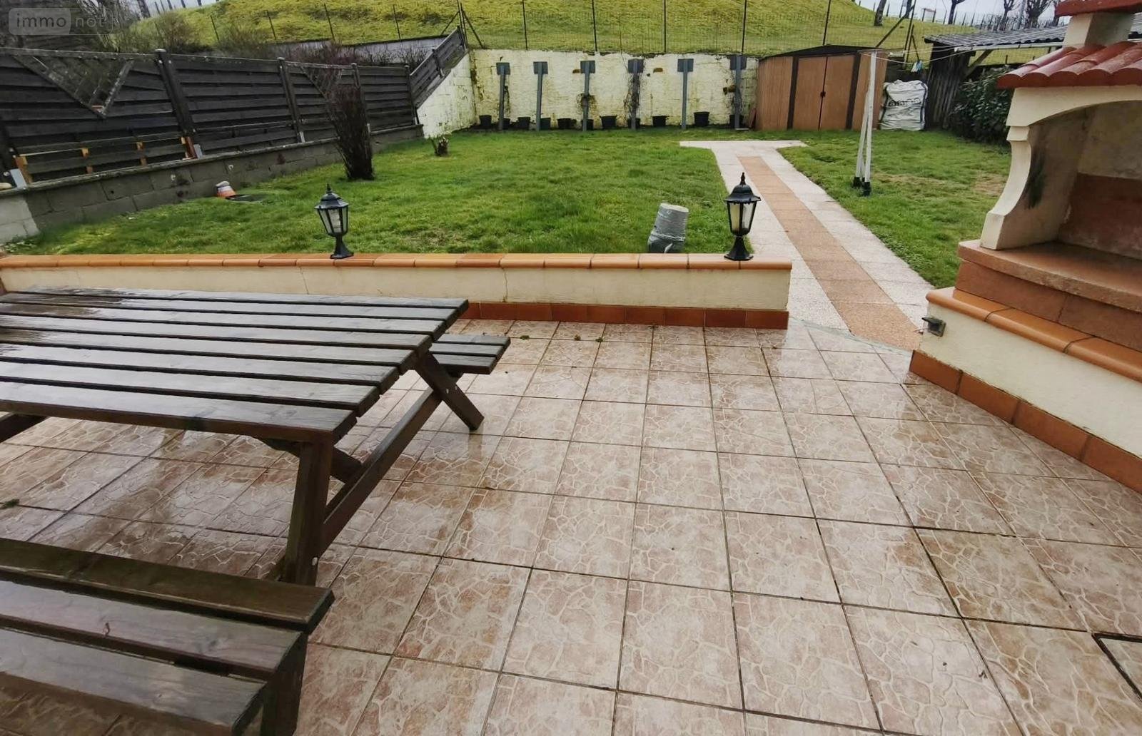 Terrasse : Dallée avec store banne manuel et barbecue - Un abri de jardin.