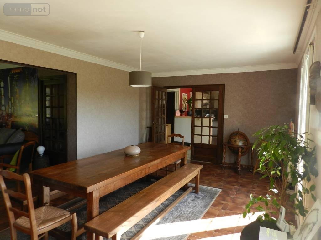 La maison construite sur un sous-sol compartimentée avec garage et chaufferie se compose au rez de chaussée d'un hall d'entrée, un salon et salle à manger de 40 m2 env avec cheminée et insert, une cuisine aménagée, une chambre, une salle de bains et un wc.
