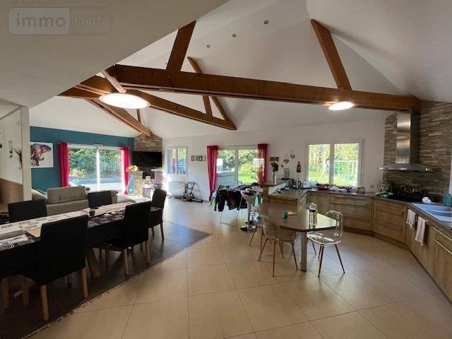Salon-séjour avec poêle à granules ouvert sur une cuisine aménagée et équipée, arrière-cuisine, WC, salle de bains, quatre chambres dont une suite parentale avec douche et baignoire.
