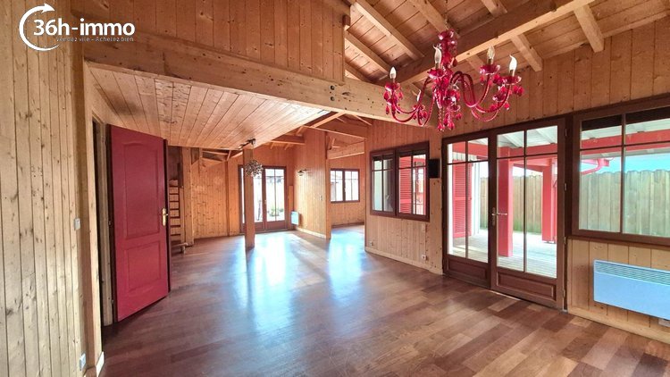 Cette maison en construction bois à étage est composée au rez-de-chaussée d'une gr ...