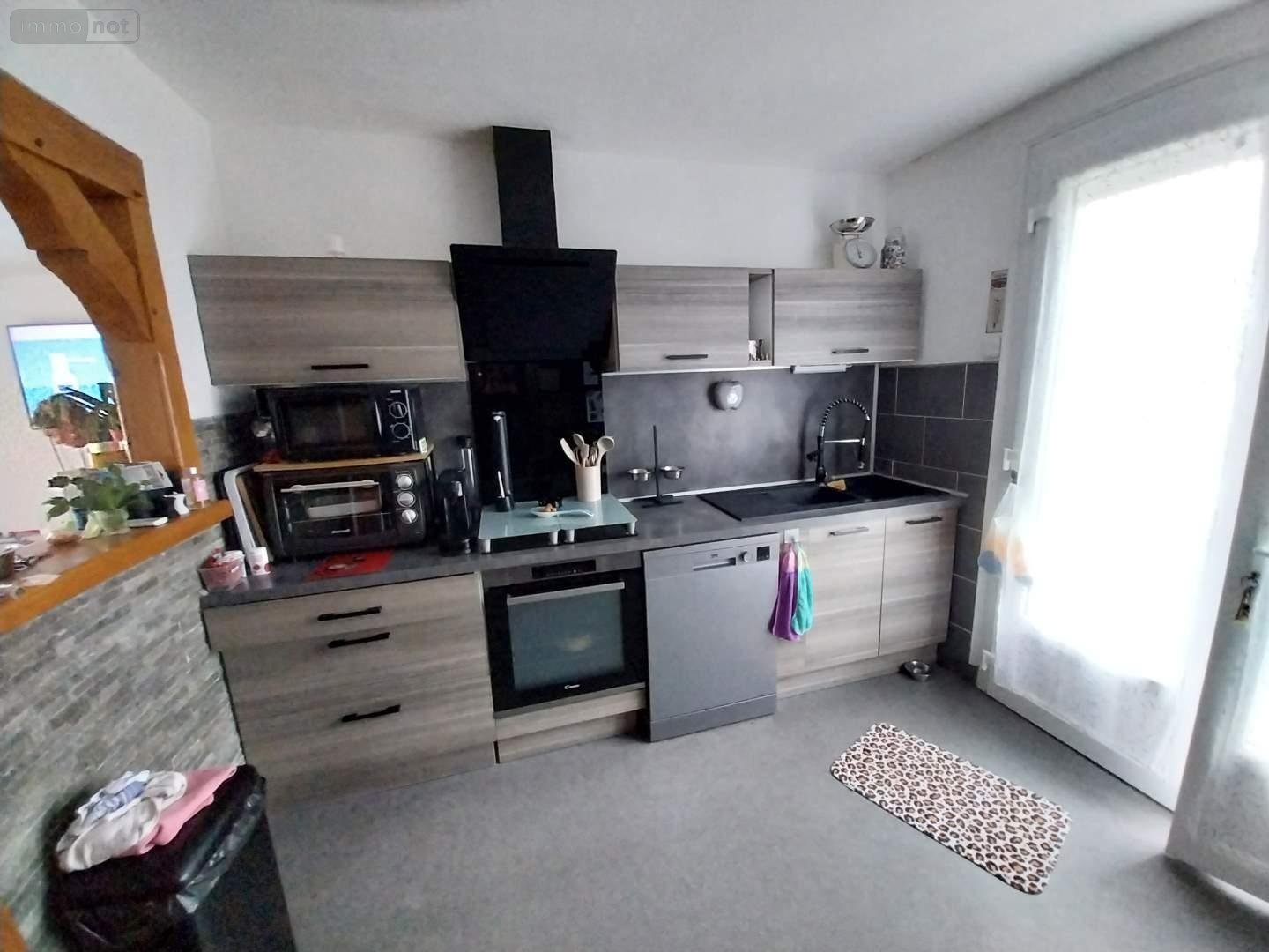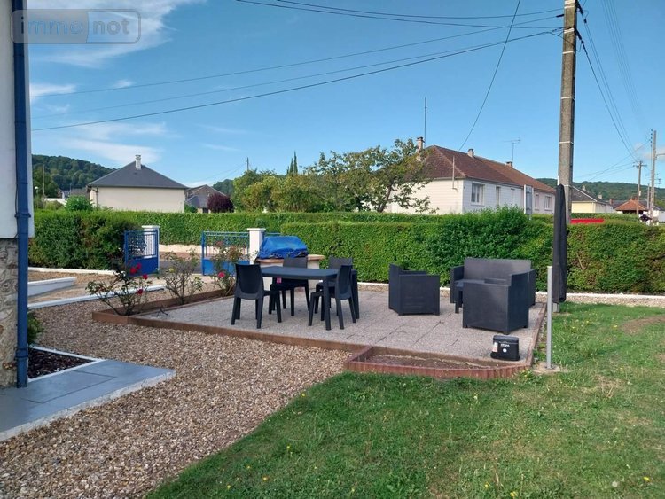 PONT AUDEMER, Maison T4 S. Hab. : 73m² - Sur un terrain d'environ 800 m2, maison de plain pied composée d'une cuisine aménagée et équipée de plaques, four et hotte, un séjour avec coin salon, dégagement avec placards, 3 chambres, salle de bains, wc. Sous sol total.