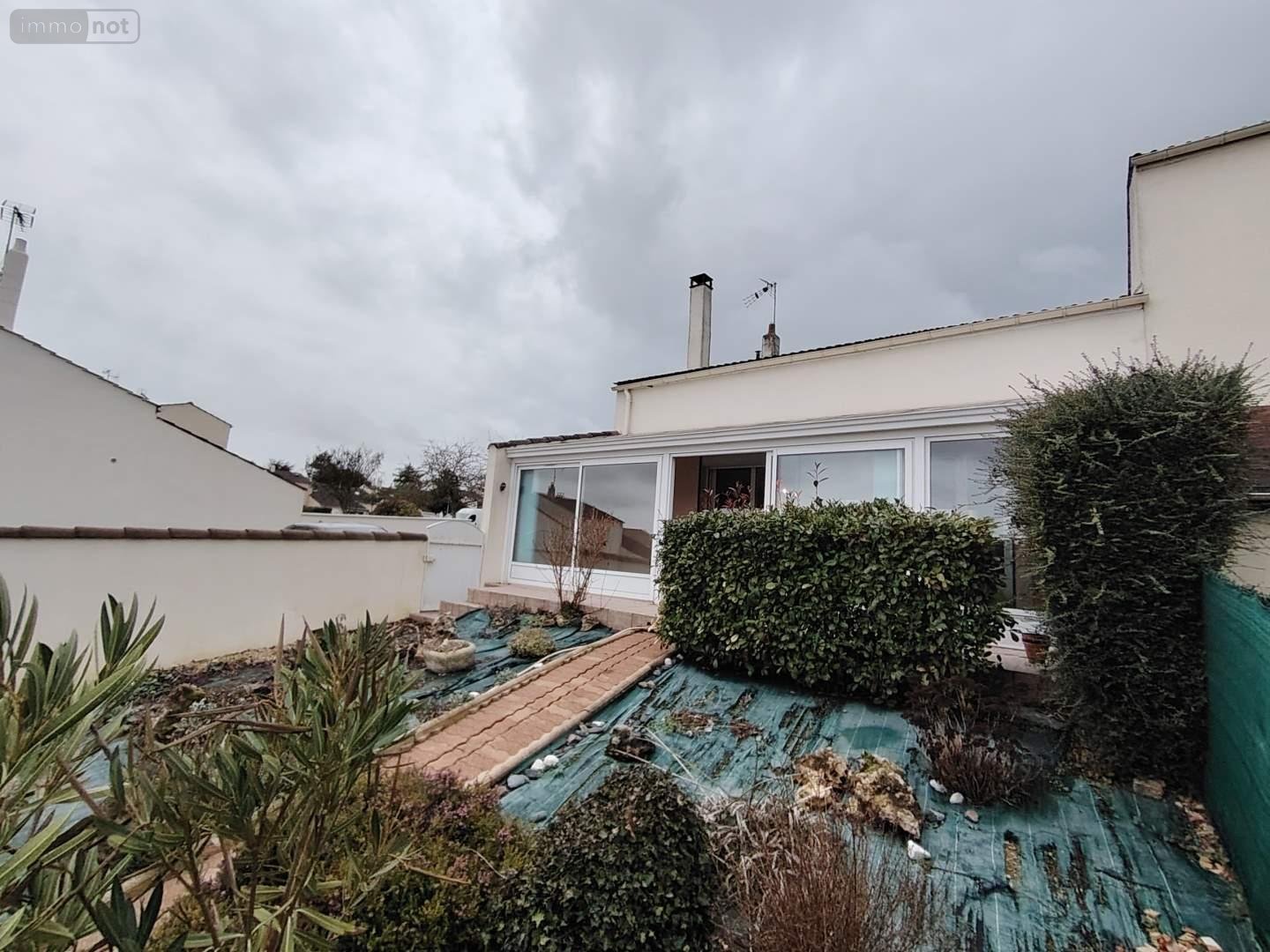 A l'étage : palier, deux chambres, deux pièces mansardées utilisables en chambre ou bureau, salle de bains avec wc. Garage attenant. Cave sous partie. Terrain.