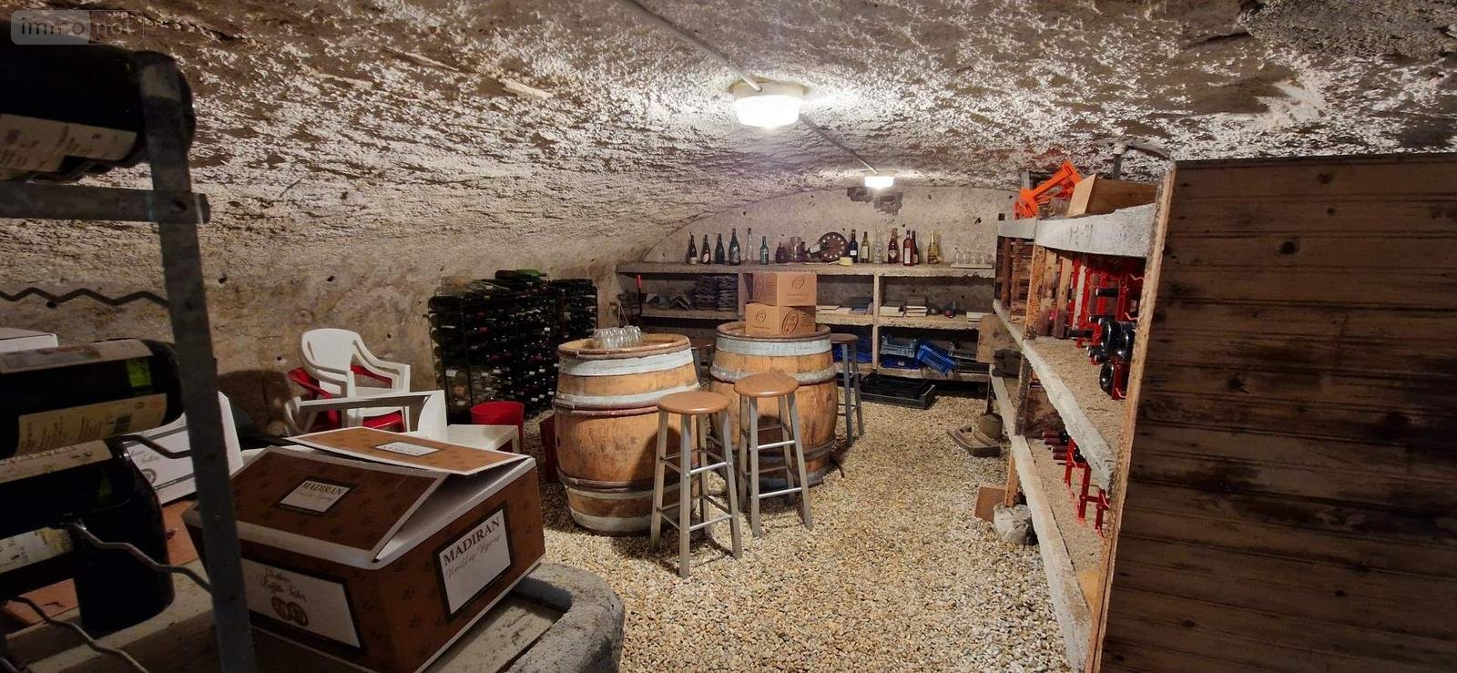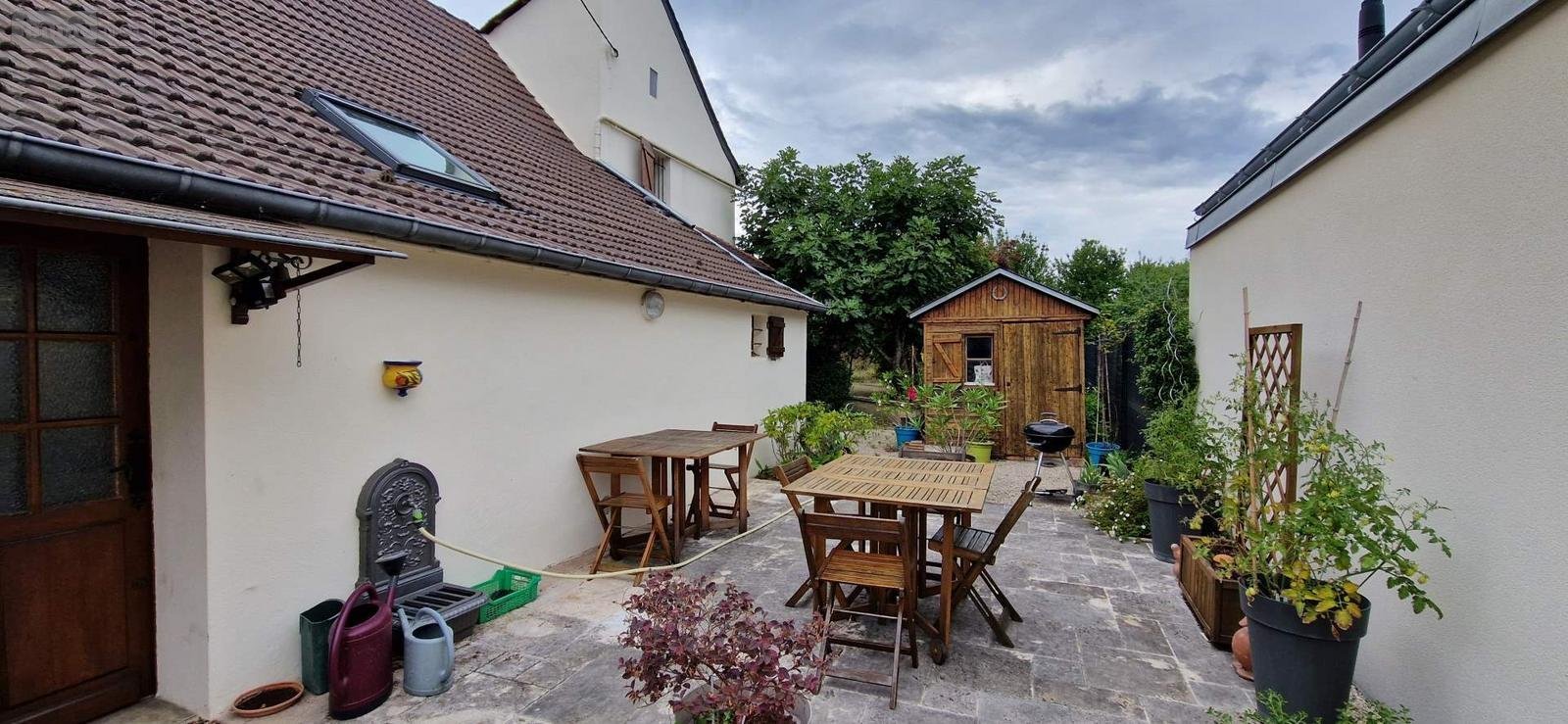 Un jardin avec terrasse, cabanon de jardin, parking, accès à une belle cave voutée.