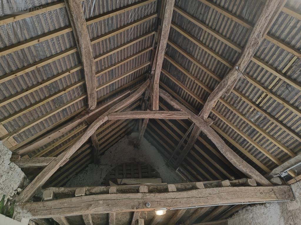 En retour d'équerre (possibilité de faire communiquer avec la maison d'habitation) une grange de 60m² environ avec pas de vis de l'ancien pressoir et deux immenses tonneaux. Préau ou grange ouverte dans la continuité, suivi d'une cave voûtée.