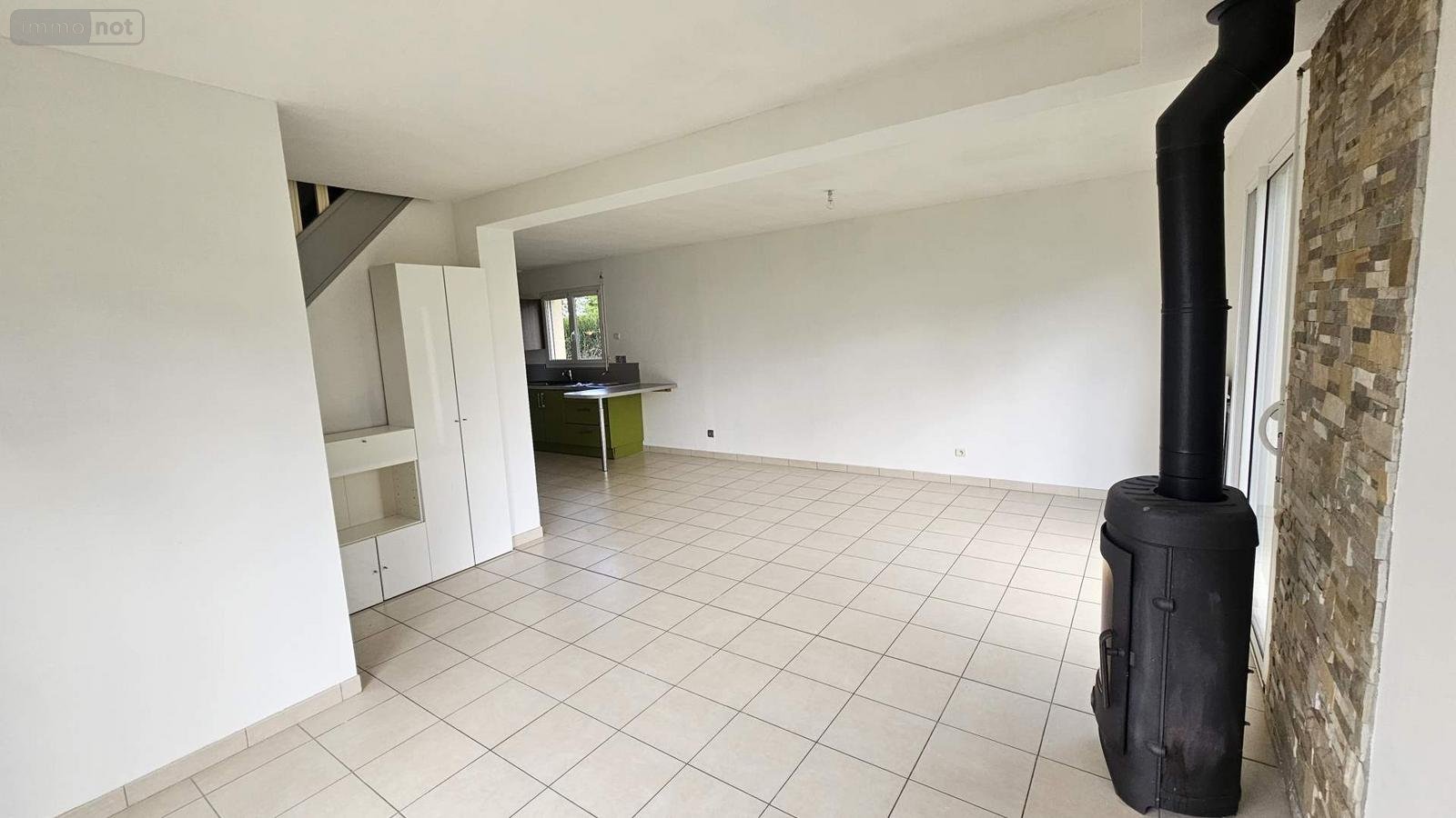 Au rez-de-chaussée : Une entrée avec placard, un séjour/salon avec poêle à bois, cuisine ouverte aménagée et équipée, un WC, une chambre