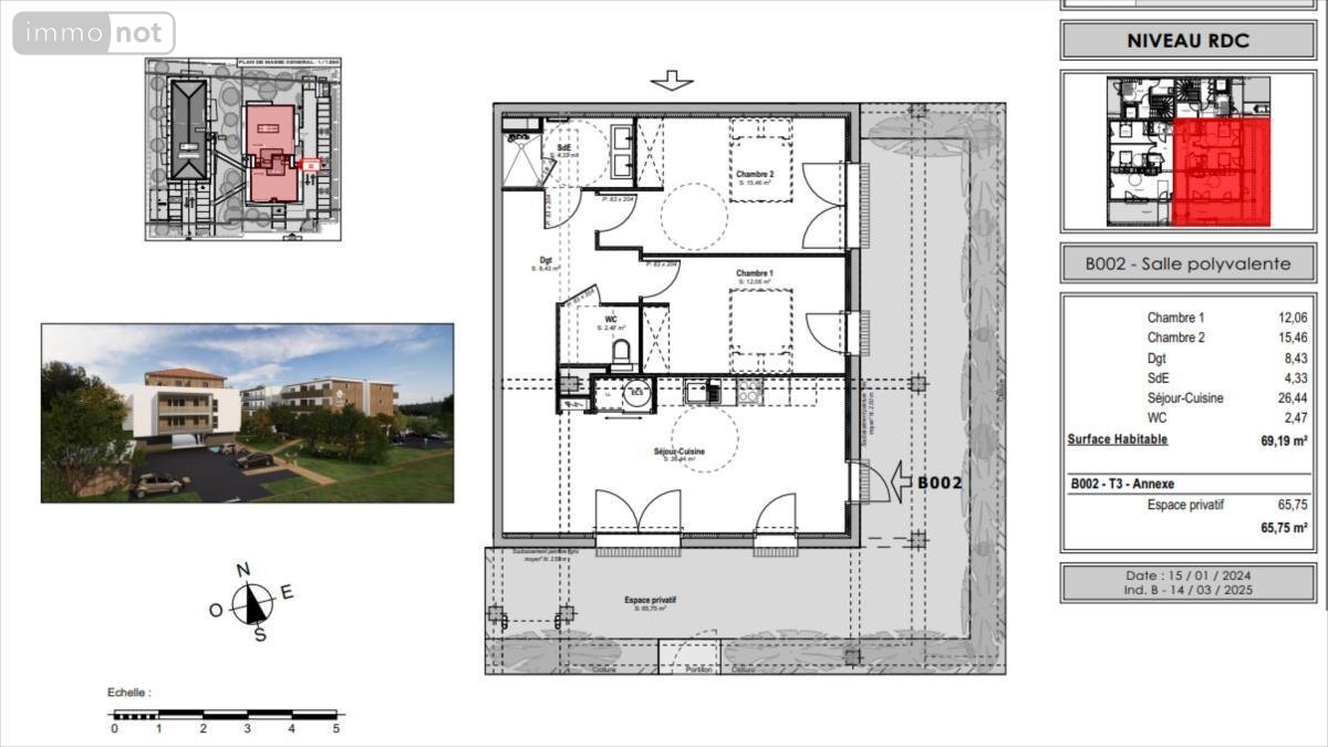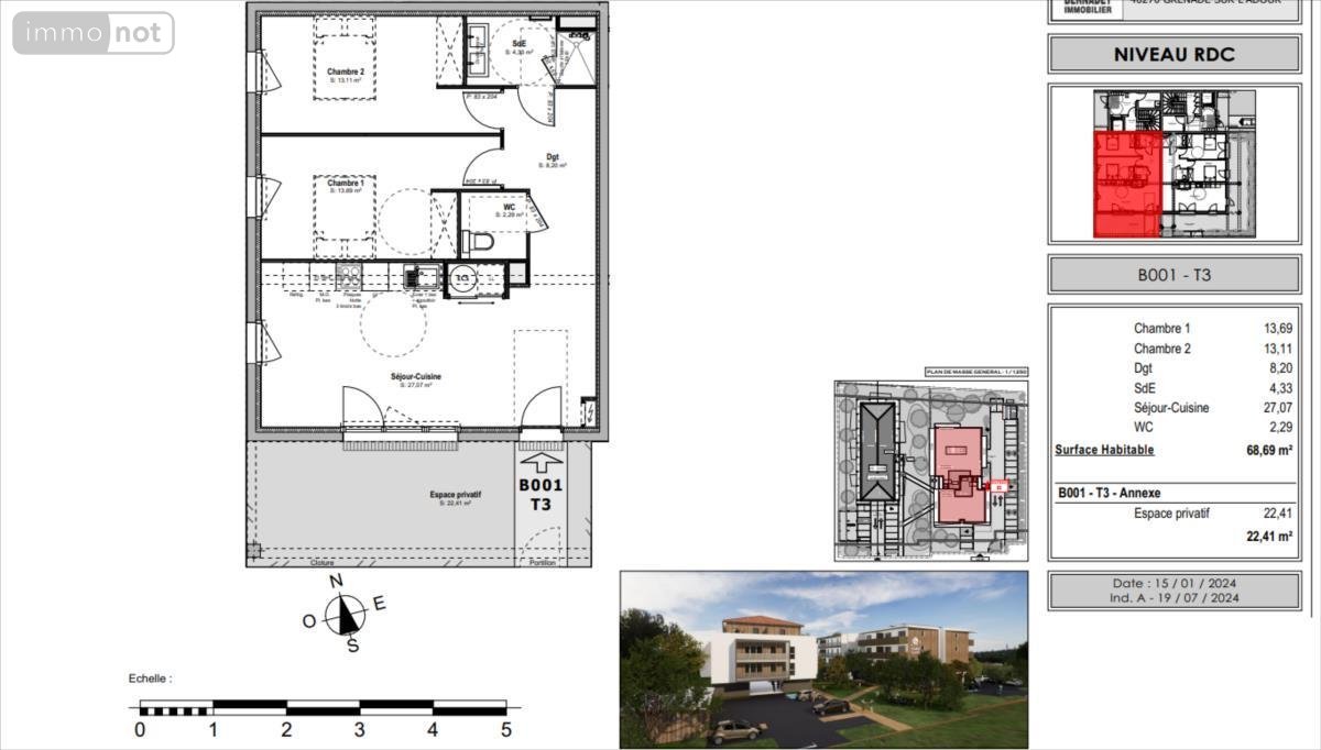 T3 - 69,19 m² avec partie privative de 62.75 m² et parking aérien - rez-de-chaussée - 254 400 euros hors frais de notaires T2 - 43 m² avec loggia de 11 m² et parking aérien (12 logements T2) - 169 000 euros hors frais de notaires
