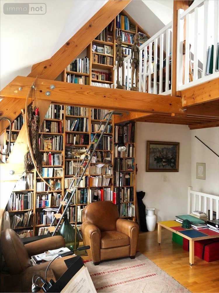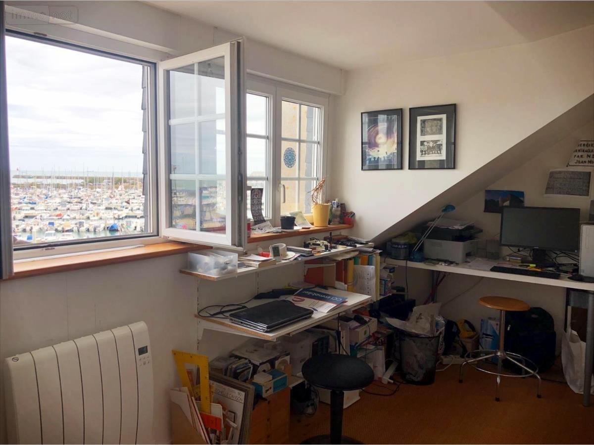 - Au-dessus: grande pièce traversante avec plafond cathédrale, lumineuse, aménagée de part et d'autres de hautes bibliothèques, avec salle d'eau privative (dans laquelle douche, lavabo, et W.C.). Belle pièce mezzanine à la suite, bénéficiant d'une magnifique vue sur le port de plaisance et l'Ile de Tatihou.