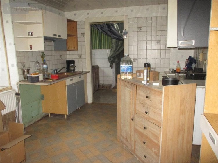 Entrée, cuisine avec ancienne cheminée en pierre, salon avec cheminée-insert,