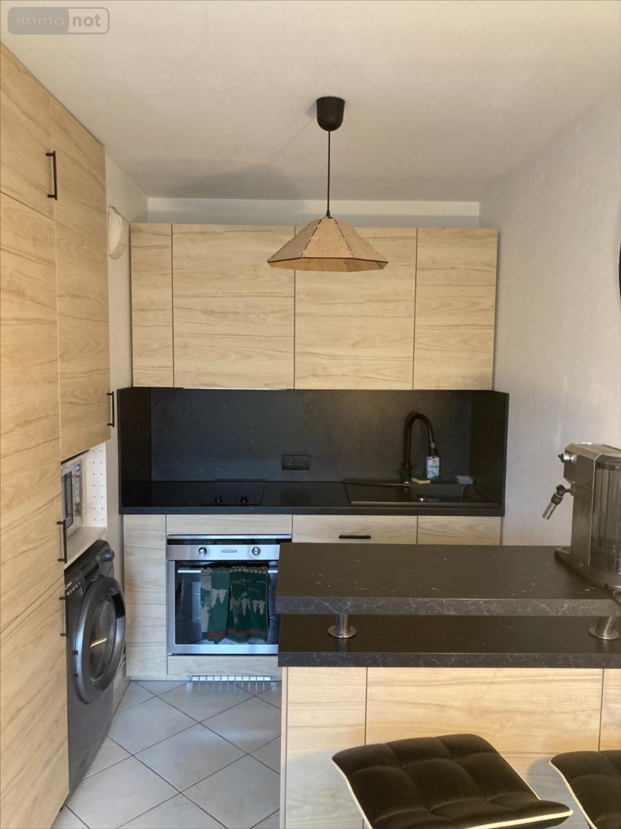 Entrée avec placard, séjour ouvert sur cuisine aménagée et équipée (meuble haut et bas, four, plaque, lave vaisselle, lave linge), salle de douche avec wc, une chambre avec placard