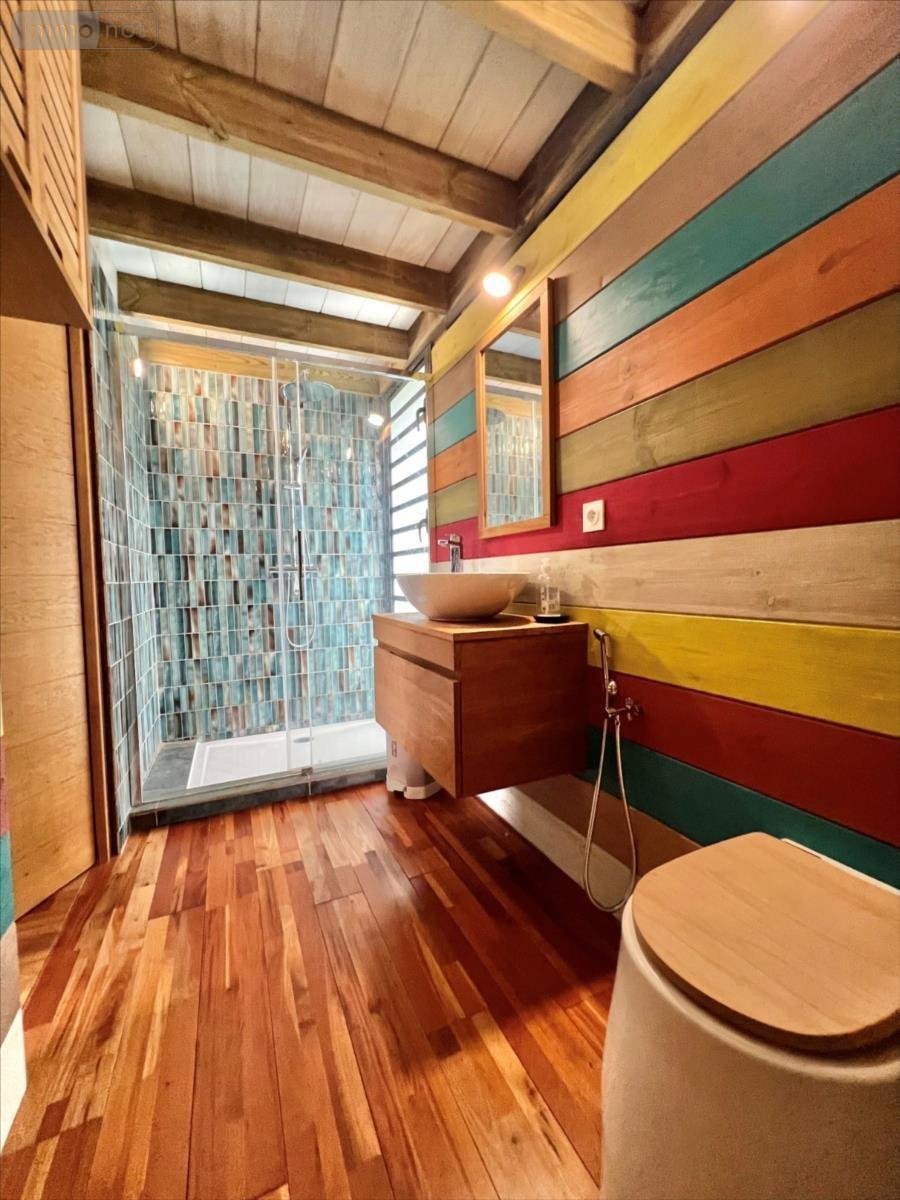 En contrebas, dans un environnement verdoyant, un bungalow bois climatisé, sans vis-à-vis, d'une surface utile d'environ 41 m² comprenant un séjour, une salle d'eau avec toilettes, un espace couchage en mezzanine et une terrasse avec cuisine.