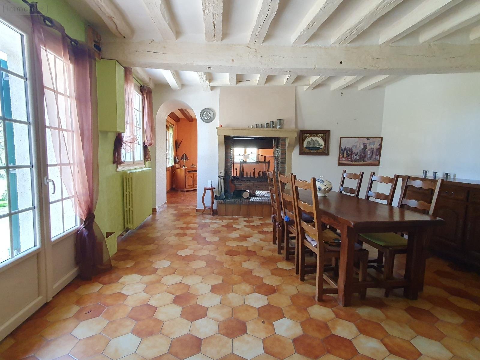 Maison de 149m² à vendre à Cherré en campagne comprenant : cuisine 16.5m², séjour 23.5m² avec cheminée à double foyer ouverte également sur le salon de 22m², couloir avec placard desservant trois chambres 13/13/12m², bureau 6m², salle d'eau 7.5m², WC, débarras, chaufferie.