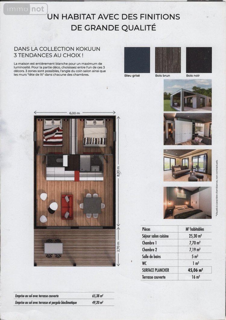 Dans un Parcs Résidentiels de Loisirs sécurisé (Statut de P.R.L.) - Au calme - Sans vis à vis - Jolie vue dégagée - Très agréable et charmante construction de type "Chalet" T3, Cottage à la décoration contemporaine de 2020, d'une superficie habitable de 43 m² avec 2 chambres ... - Vendu entièrement meublé - Terrasse couverte de 16 m², séjour/cuisine équipée de 25,30 m² -