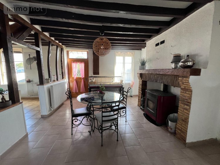 - Au rez-de-chaussée : entrée avec placard, cellier, WC avec lave-mains, cuisine aménagée, salle à manger avec poêle à granulés, salon, chambre, salle d'eau.