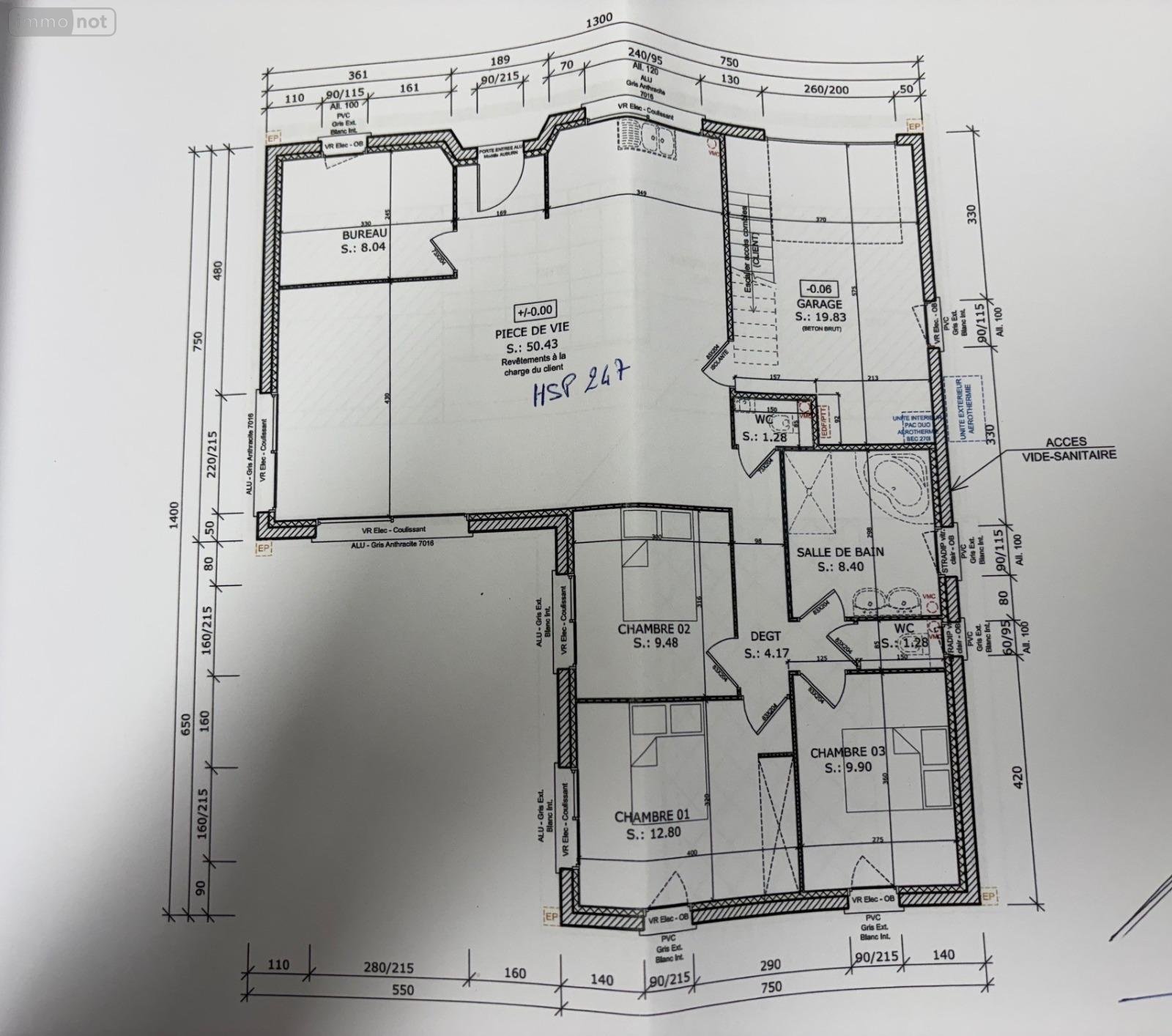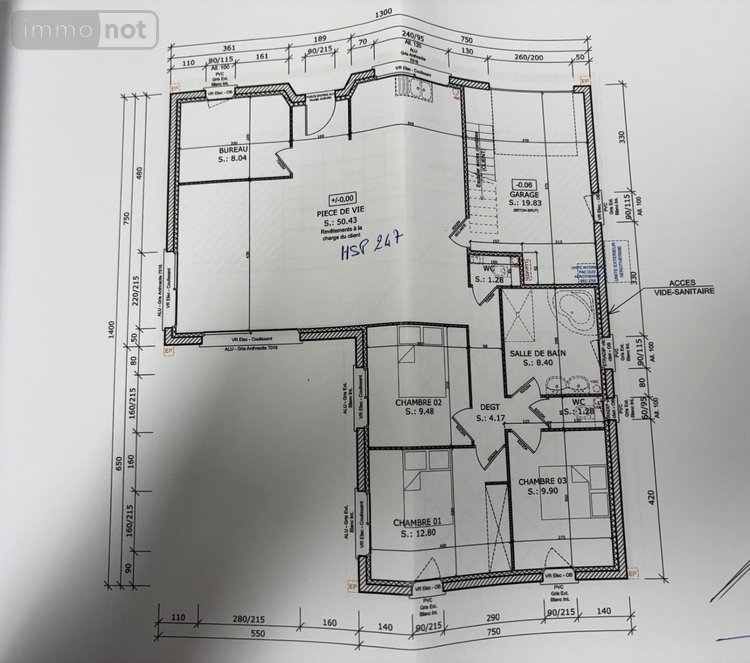 Une pièce de vie de 50m², une chambre, wc, dégagement desservant trois chambres, des wc et une salle de bains d'une grande surface avec arrivée prévue pour baignoire balnéo, douche et double vasque.