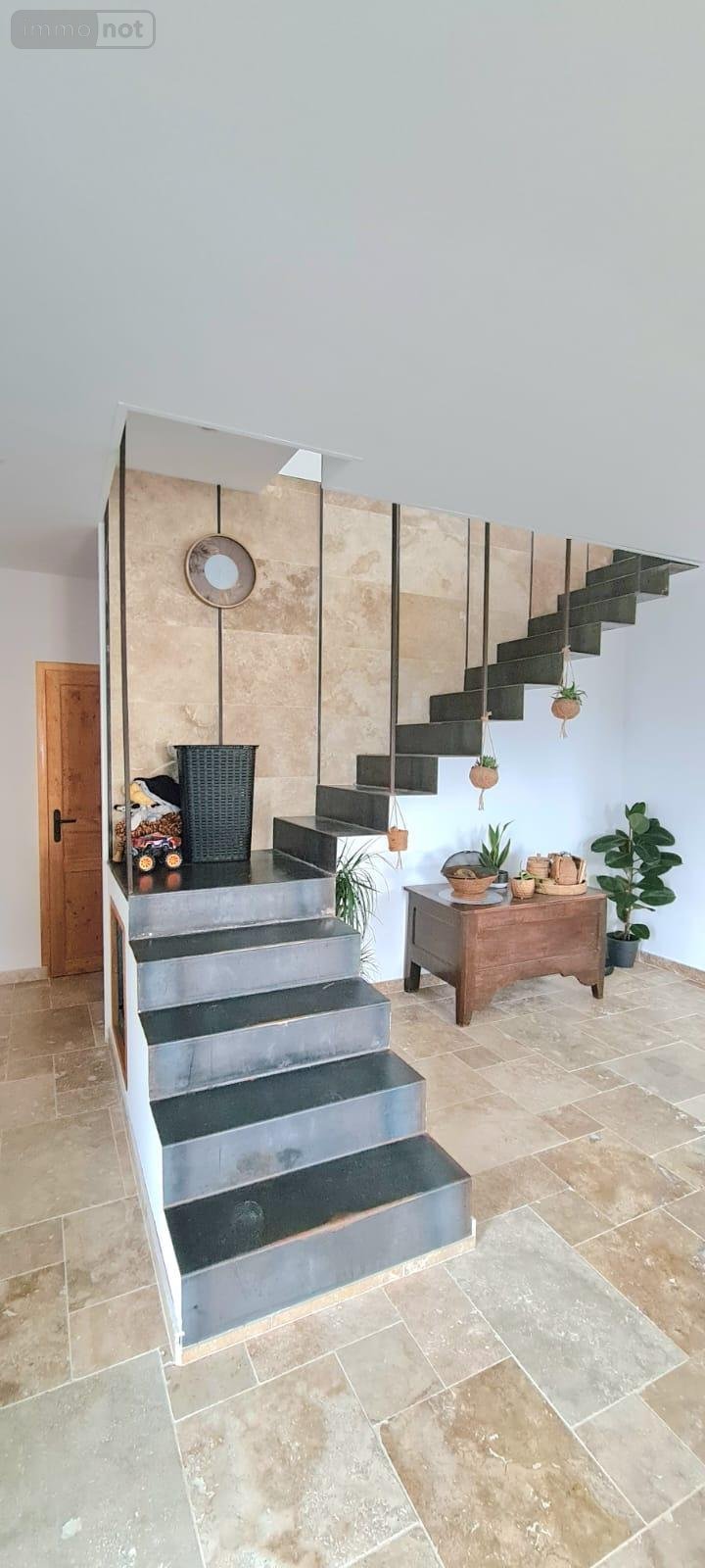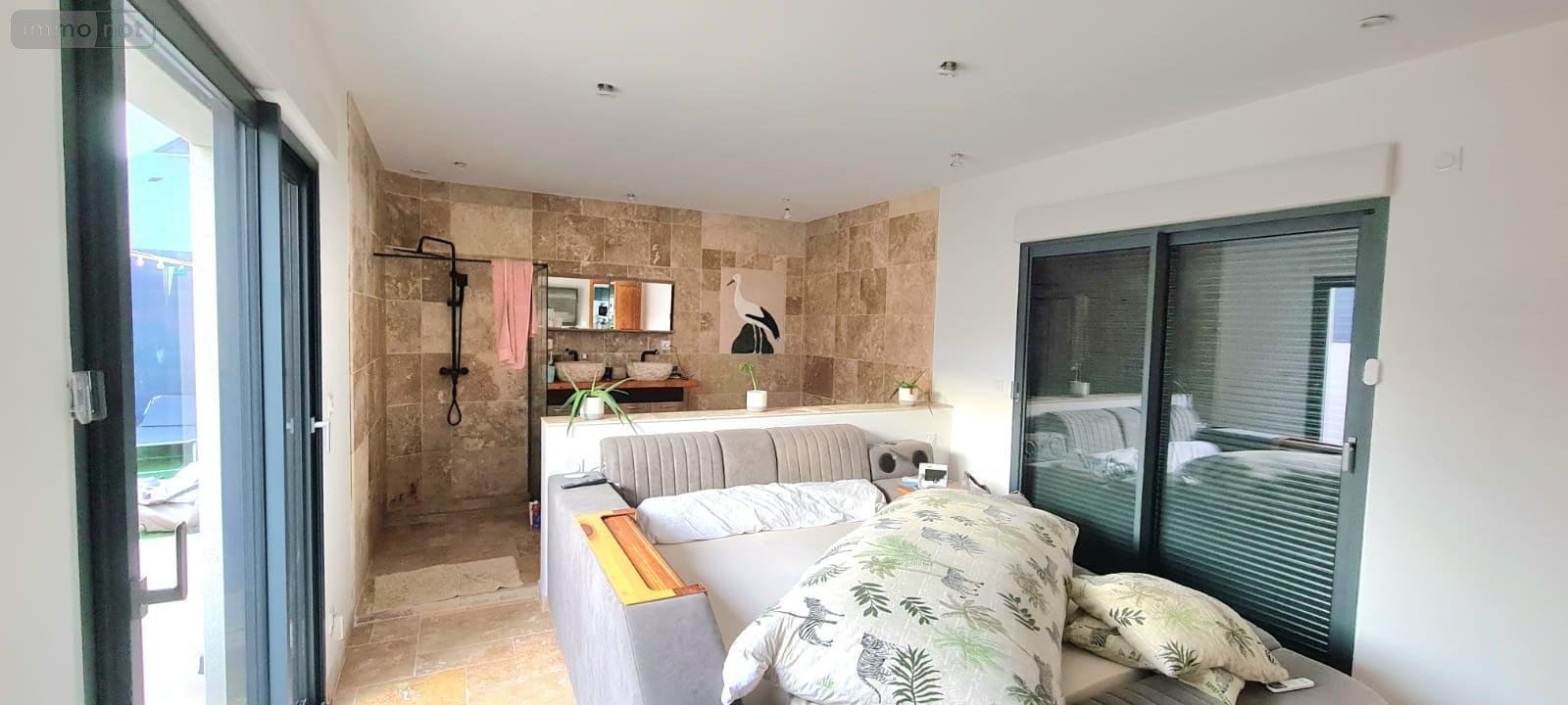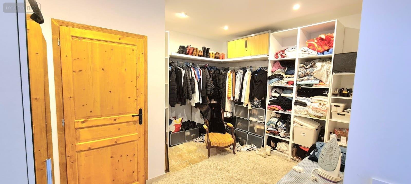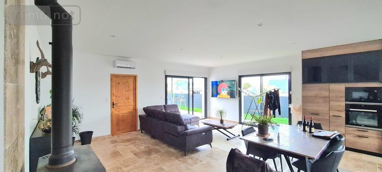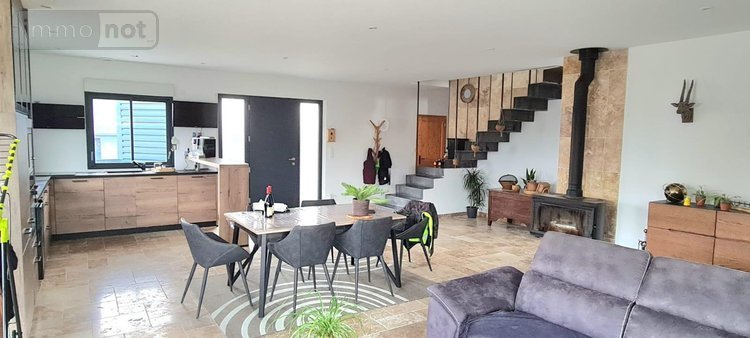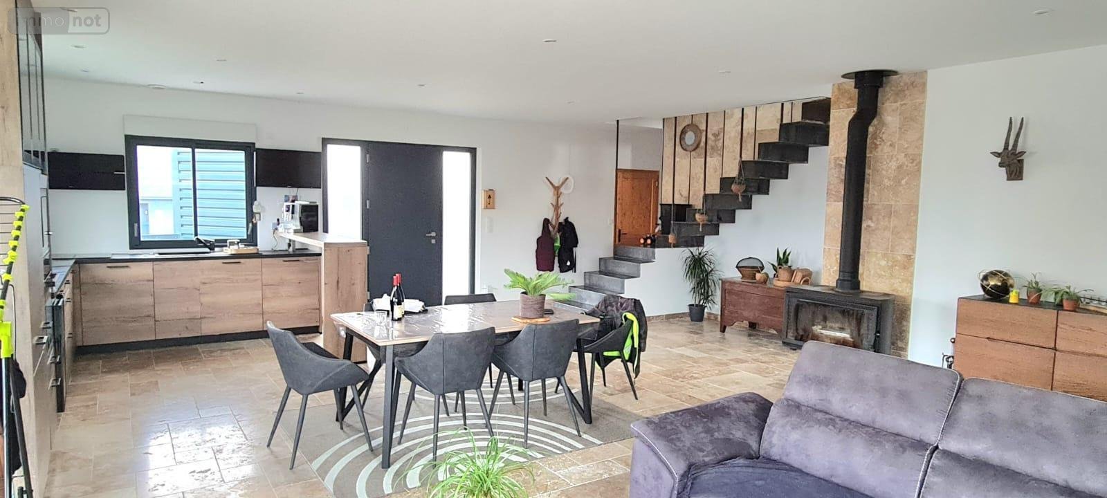 Entrée, séjour / salle à manger avec poêle à bois, cuisine aménagée et équipée, arrière-cuisine, WC, une chambre avec douche baignoire balnéo et dressing