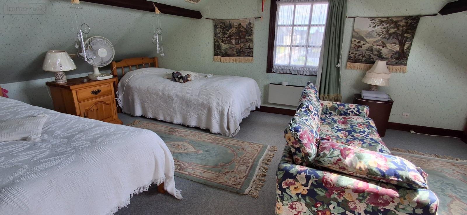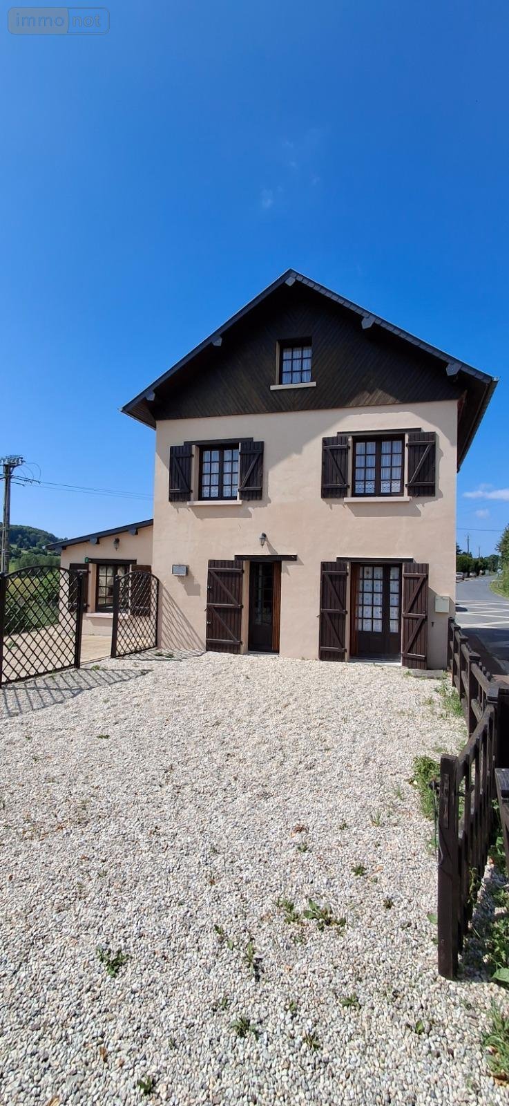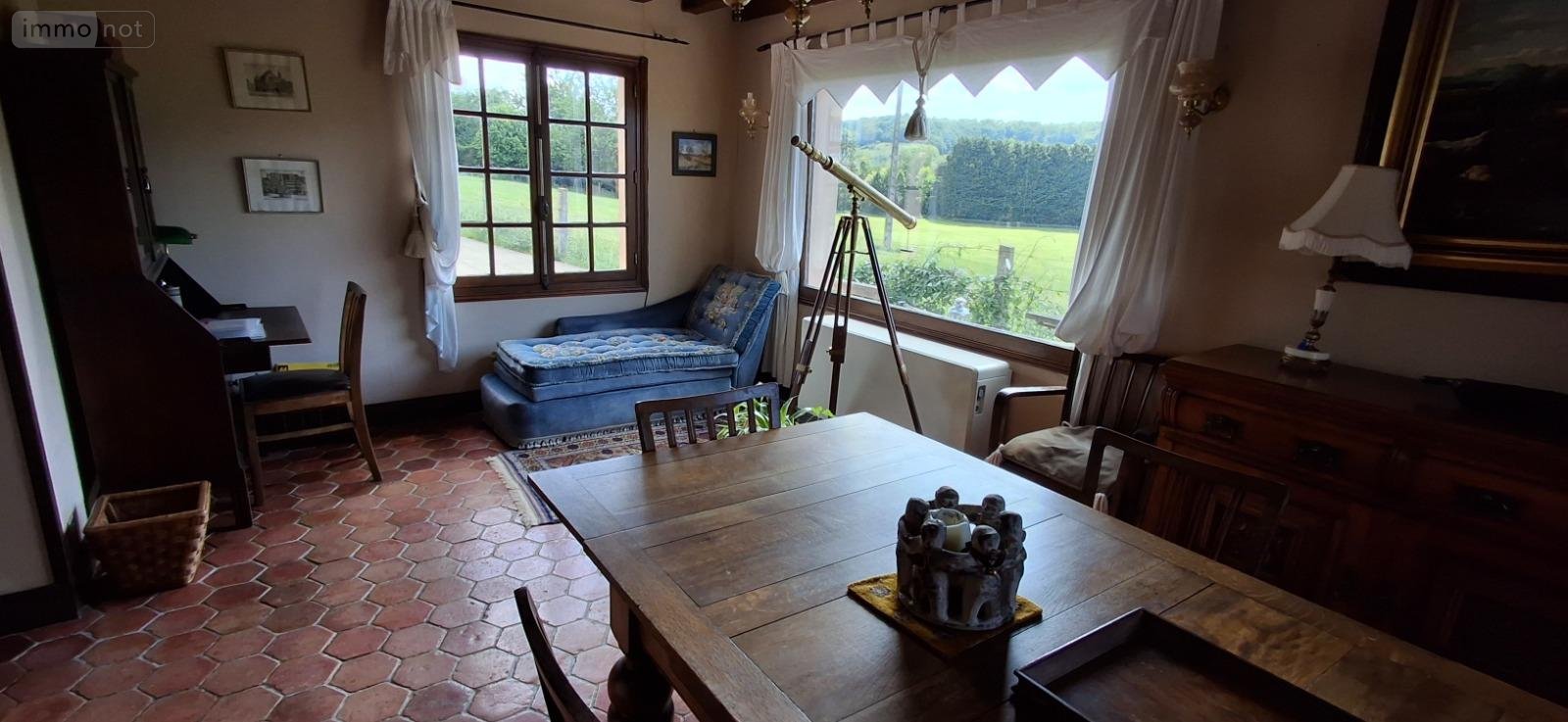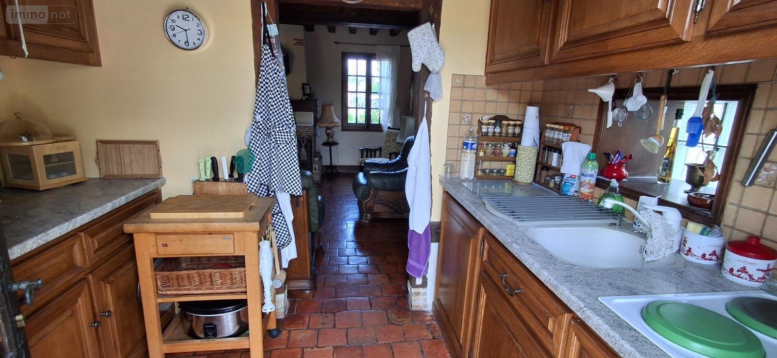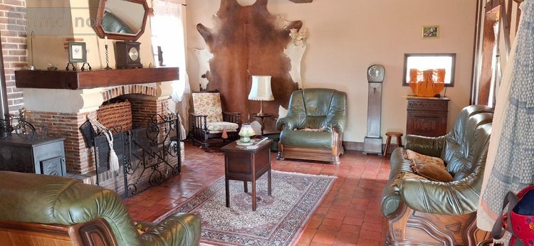 -une entrée desservant un salon avec cheminée ouverte et poêle à bois, une cuisine aménagée, une salle à manger, une buanderie avec WC.