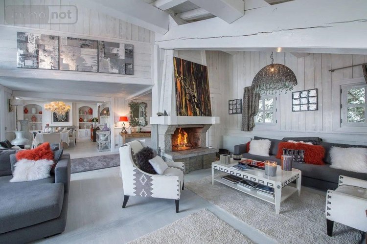 Ce chalet exceptionnel de 468m², entièrement blanc à l'intérieur comme à l'extérieur, offre une atmosphère unique et chaleureuse grâce à sa décoration soignée.