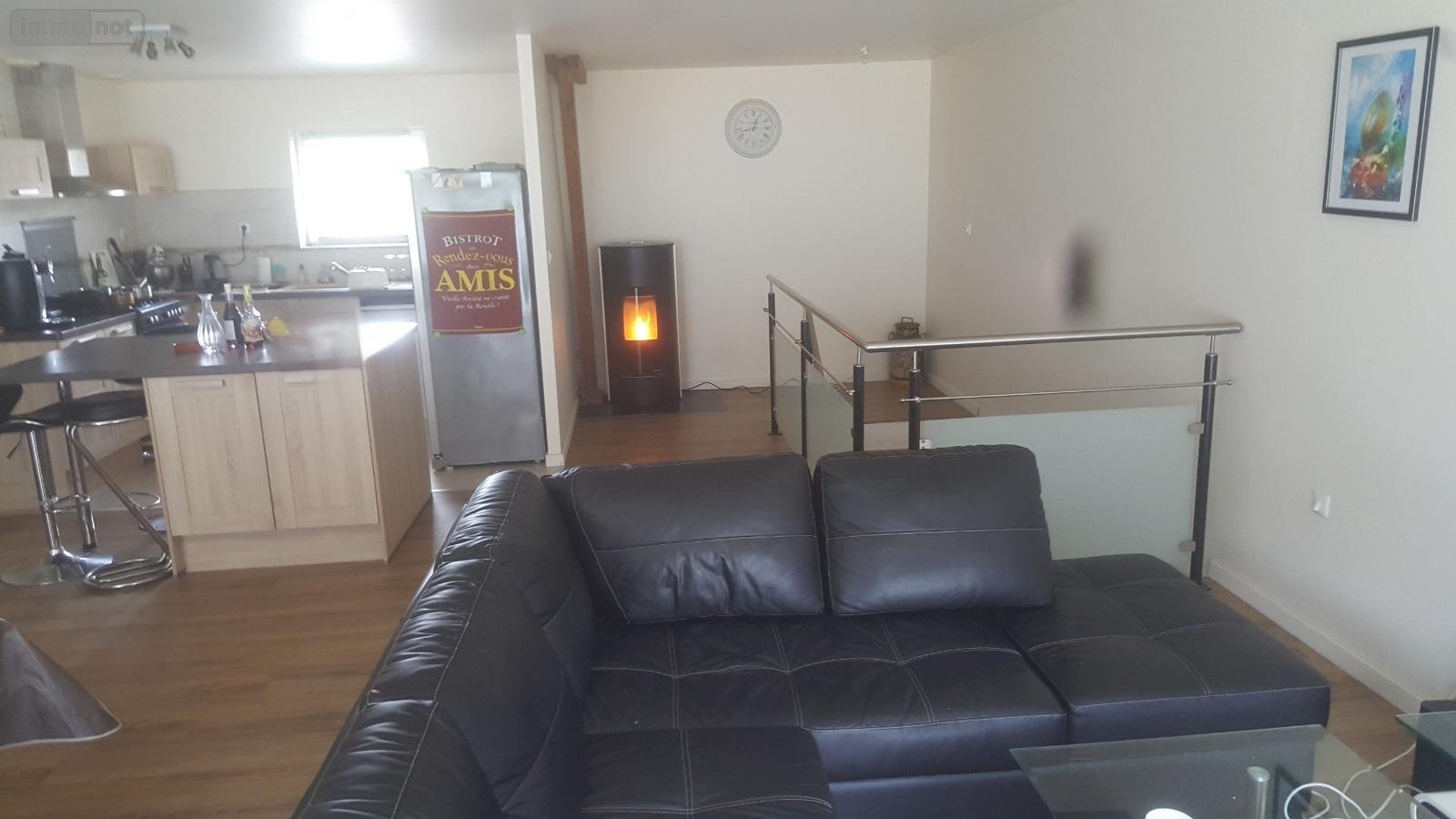 Au premier étage : séjour lumineux de 65 m² avec cuisine ouverte, poêle à pellets, une chambre, salle de douche et wc