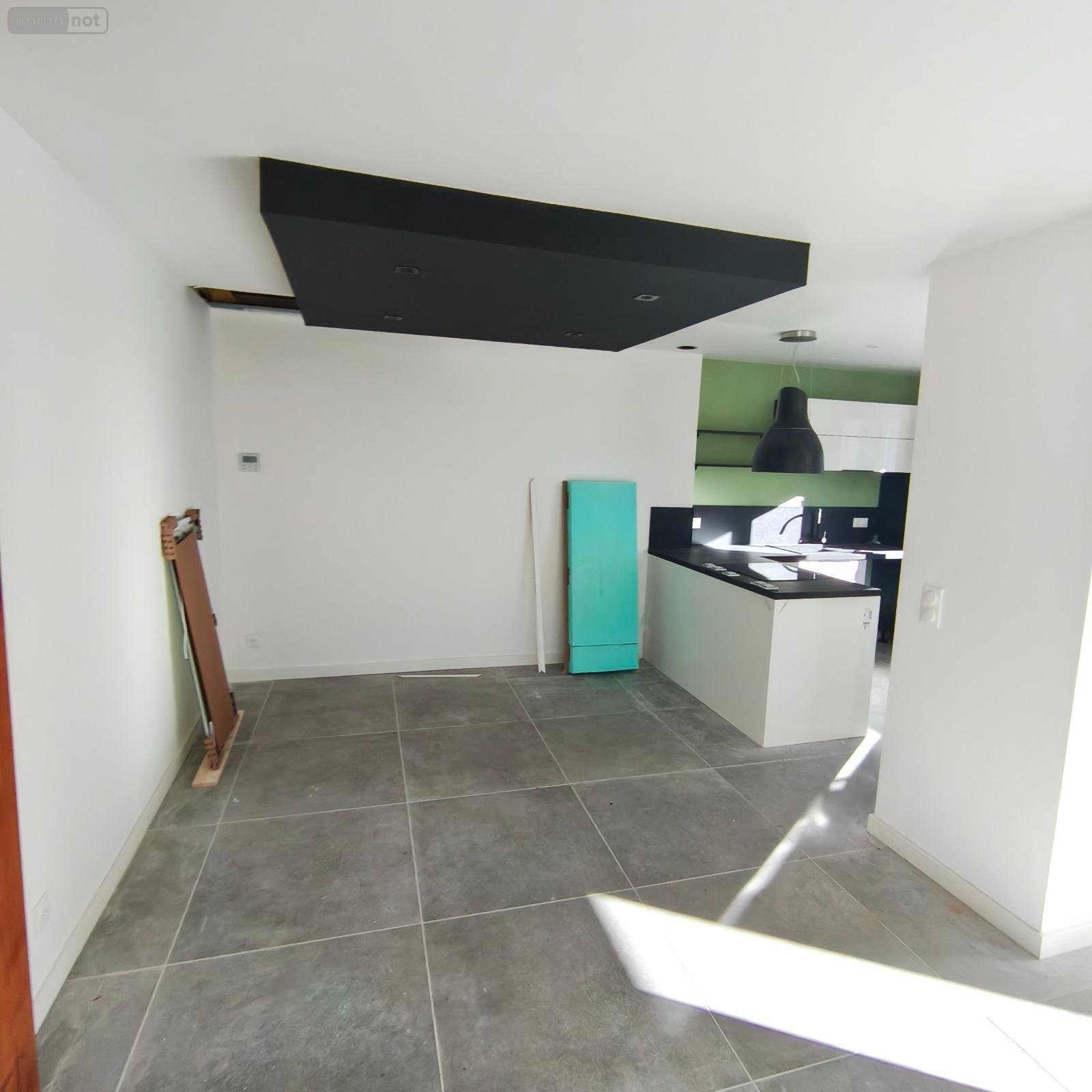Hall d'entrée, pièce à vivre proche des 50 m² avec cuisine équipée neuve et séjour et accès direct à une belle terrasse carrelée, deux chambres, salle d'eau avec douche à l'italienne, Wc séparés.
