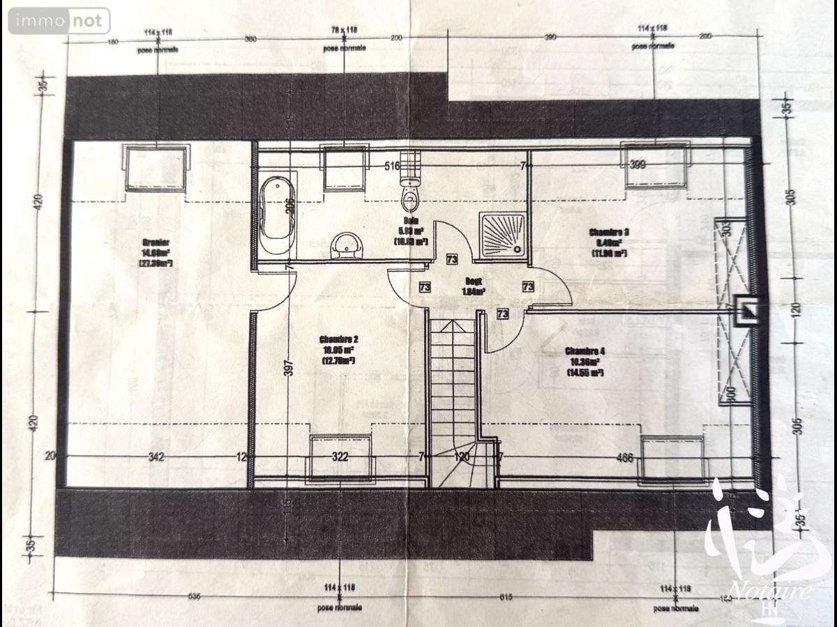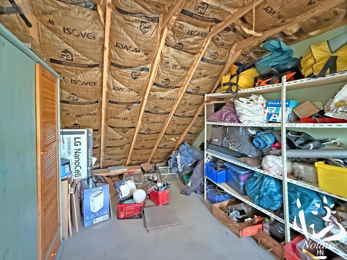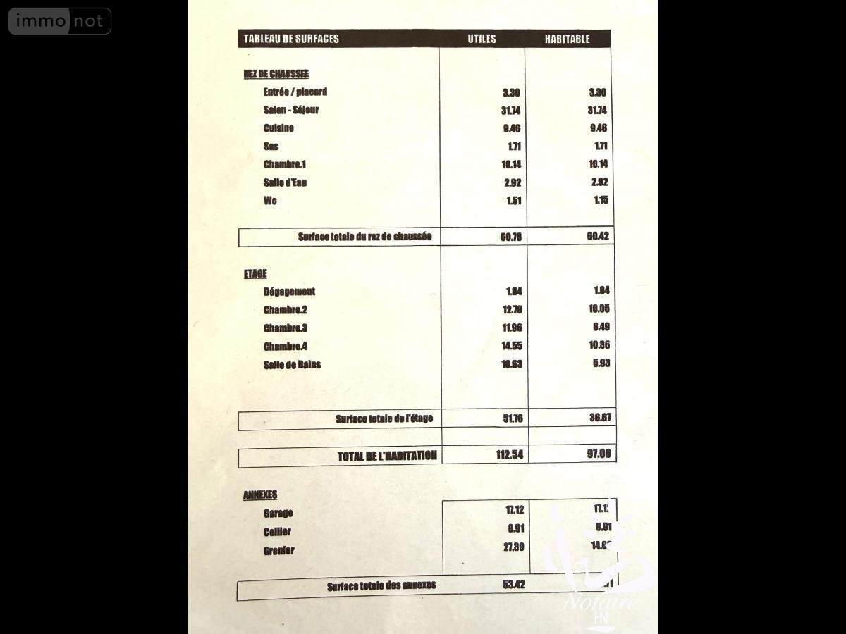 A l'étage, une salle de bain comprenant baignoire et douche, wc, lavabo, 3 chambres dont une qui s'ouvre sur le grenier de 14 m2 au-dessus de 1,80 m de hauteur.