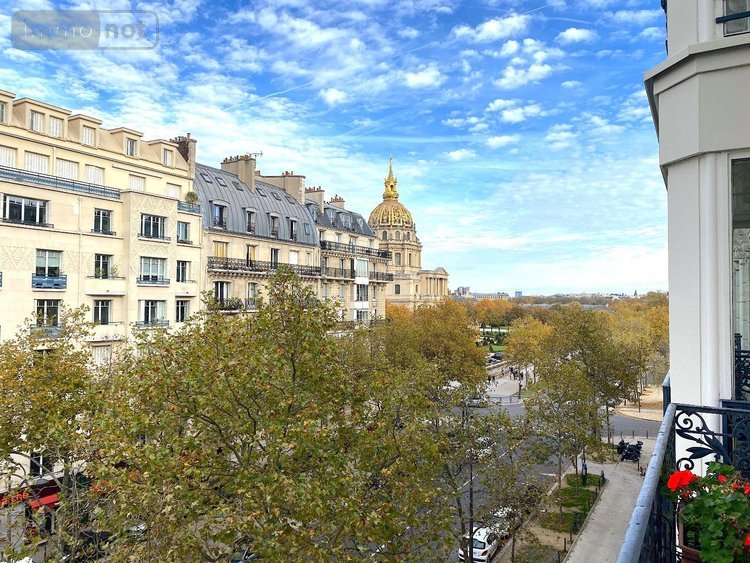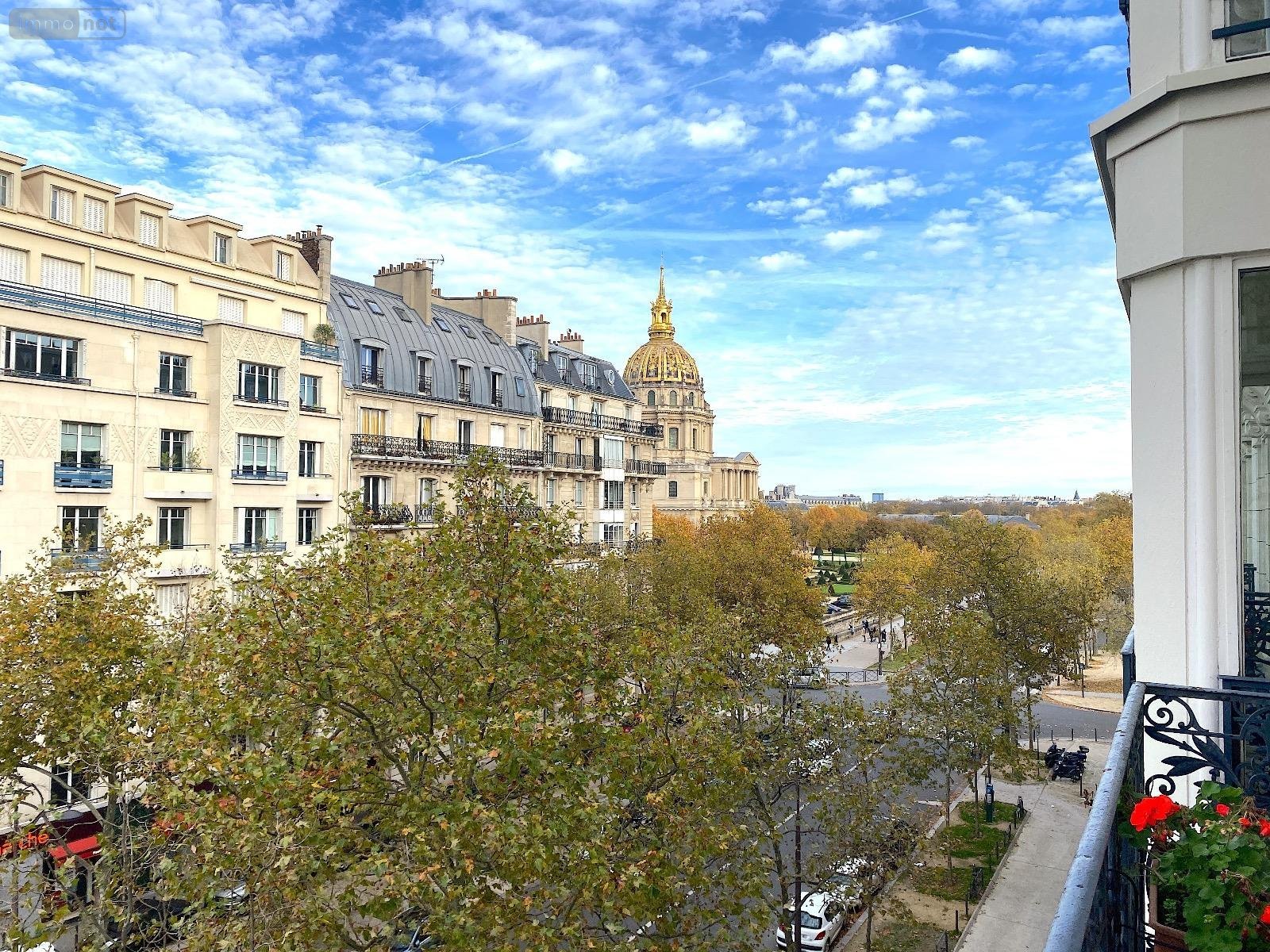 Deux balcons discrets offrent une vue historique de Paris : la Tour Eiffel, le dôme doré des Invalides, dans leur lumière changeante.