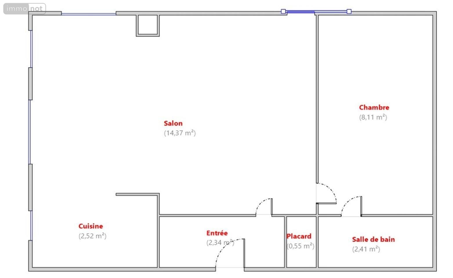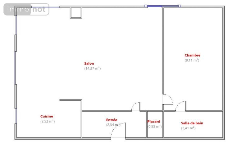 L'appartement comprend un salon (14m²) ouvert sur cuisine, une entrée avec placard, une chambre (8m²) donnant sur une salle de bains.