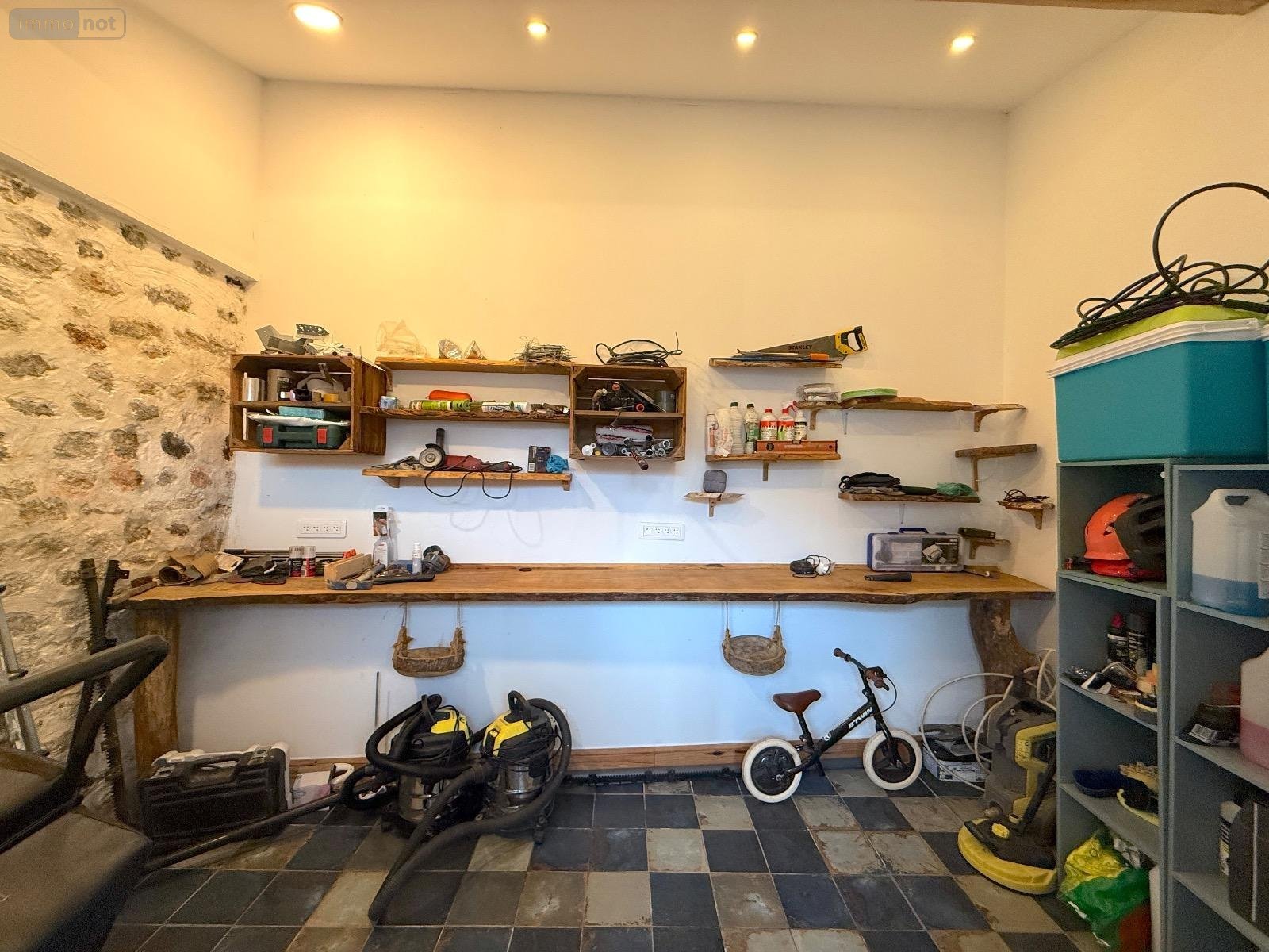 Le grand séjour réunit salon et cuisine dans un même espace. Poutres apparentes, pierres au mur, lumière douce. On s'y sent bien. L'ambiance est douce, la chaleur vient d'une pompe à chaleur. L'étiquette D du DPE en dit assez.