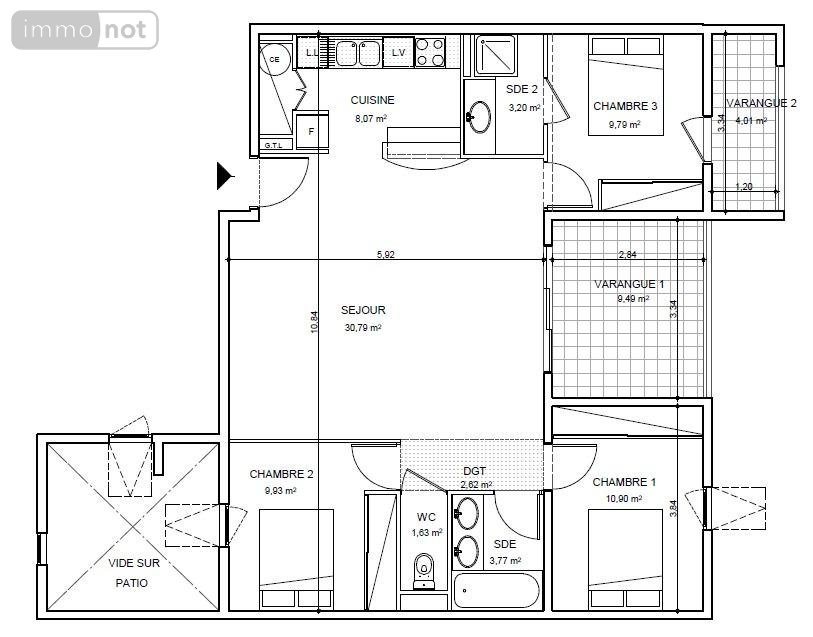 Sur la droite, de part et d'autre d'une salle de bain et d'un WC séparé, se trouvent 2 chambres climatisées respectivement de 11m² et 10 m².