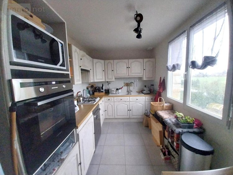 Cosmes en Mayenne (53), pavillon comprenant au rez-de-chaussée surélevé : entrée, cuisine aménagée équipée ouverte sur salon/séjour et poêle à bois, dégagement, WC, salle d'eau, trois chambres.