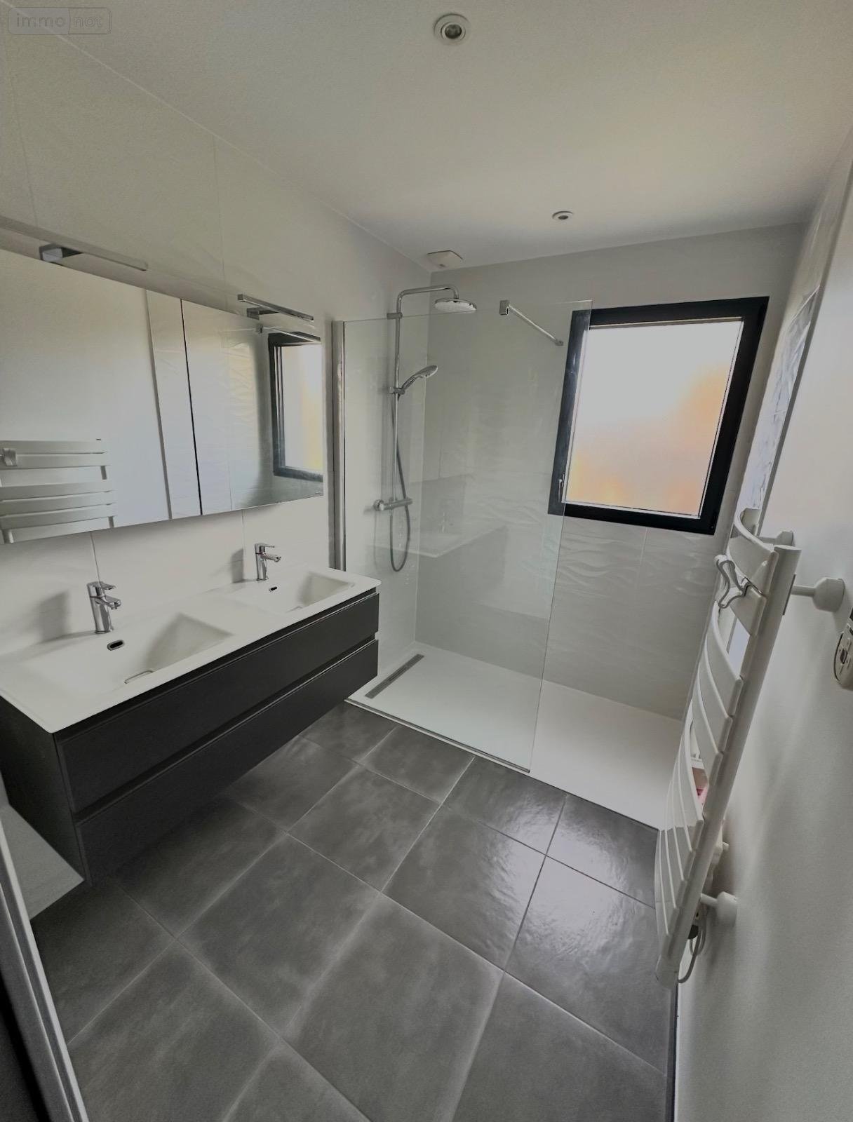 Belle pièce de vie lumineuse avec salon, salle à manger et cuisine aménagée et équipée, cellier avec accès garage, WC indépendant, suite parentale avec salle d'eau.