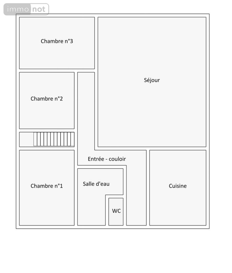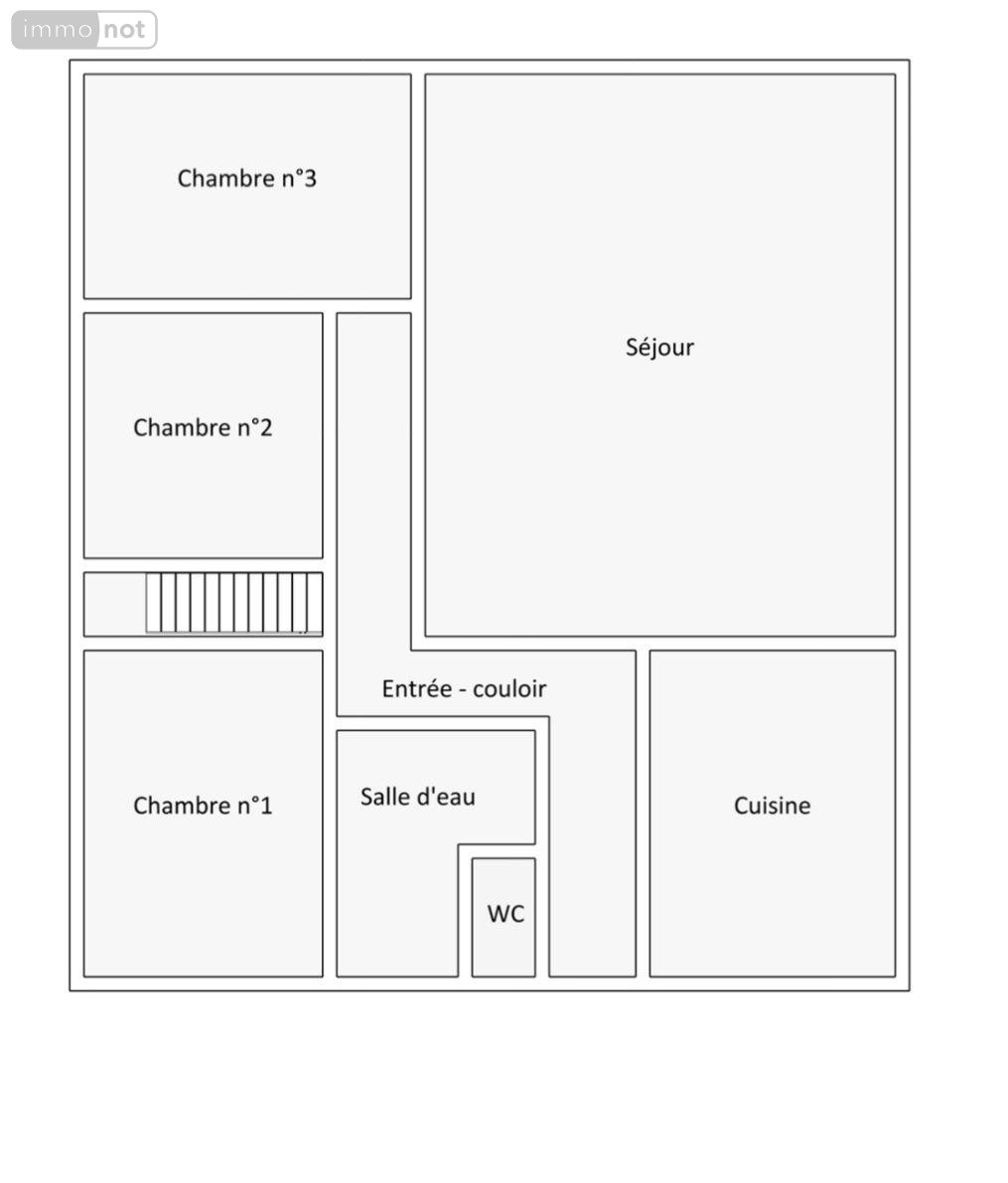 Rez-de-chaussée : Entrée, Cuisine équipée (8 m2) Séjour avec cheminée insert (27 m2), Trois chambres (9,90 - 10,05 et 11,40 m2), Salle d'eau (4 m2), WC séparé.
