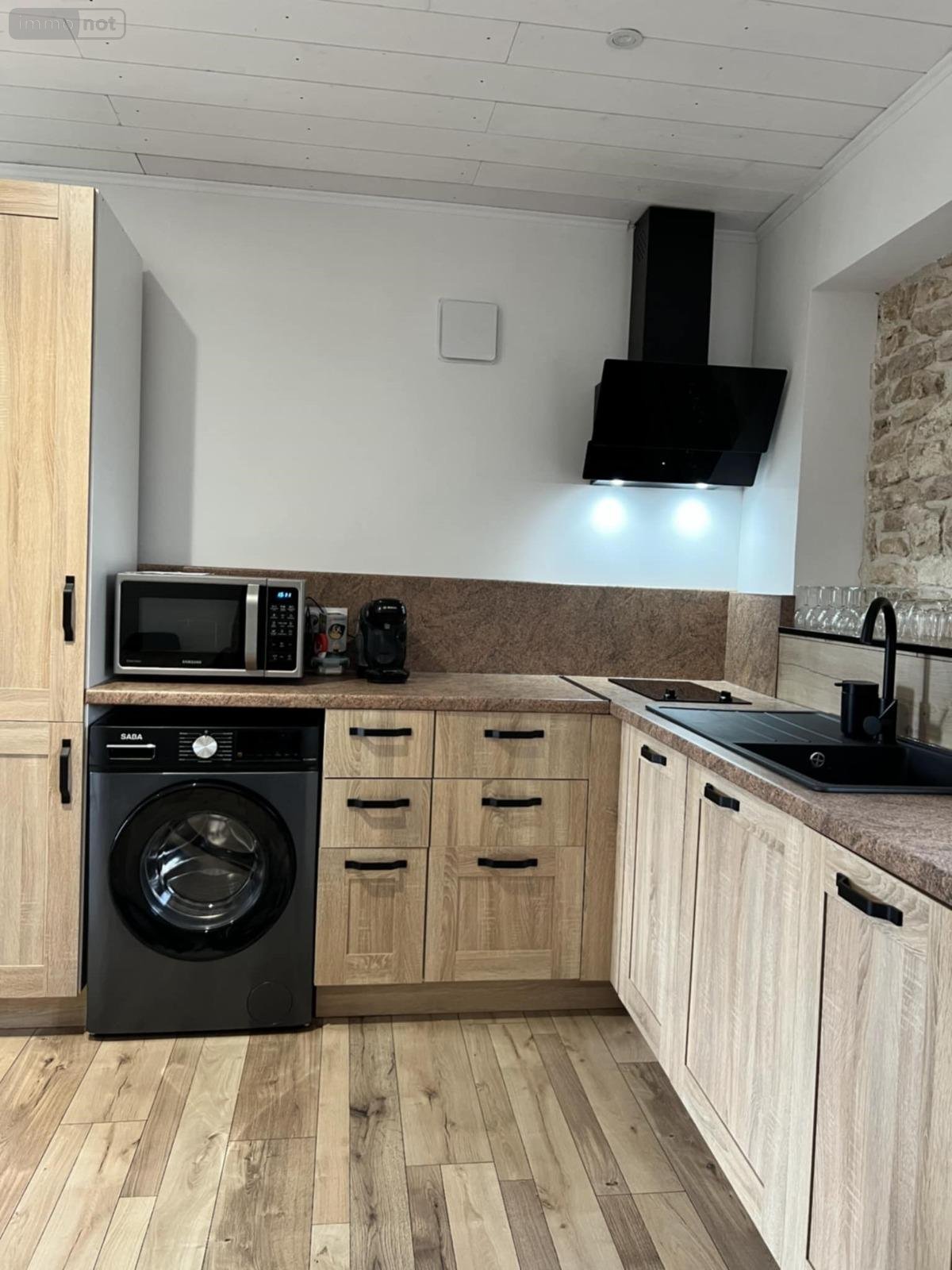 Une entrée ouvrant sur une pièce de vie lumineuse et conviviale, avec cuisine entièrement équipée (plaques, four, réfrigérateur, rangements).