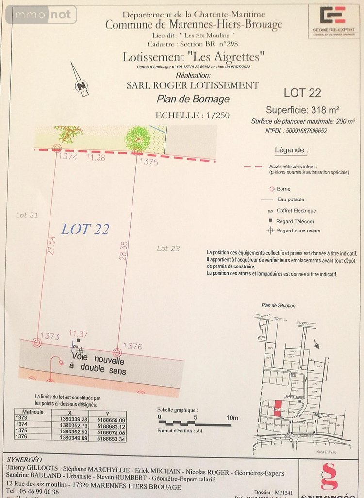 Terrain à bâtir (lot 22) à vendre à MARENNES (Marennes-Hiers-Brouage) en Charente-Maritime (17), d'une surface de 318 m2 bornée et viabilisée dans lotissement de 37 lots, proche du centre-ville et des commerces. Pour plus de renseignements nous consulter.