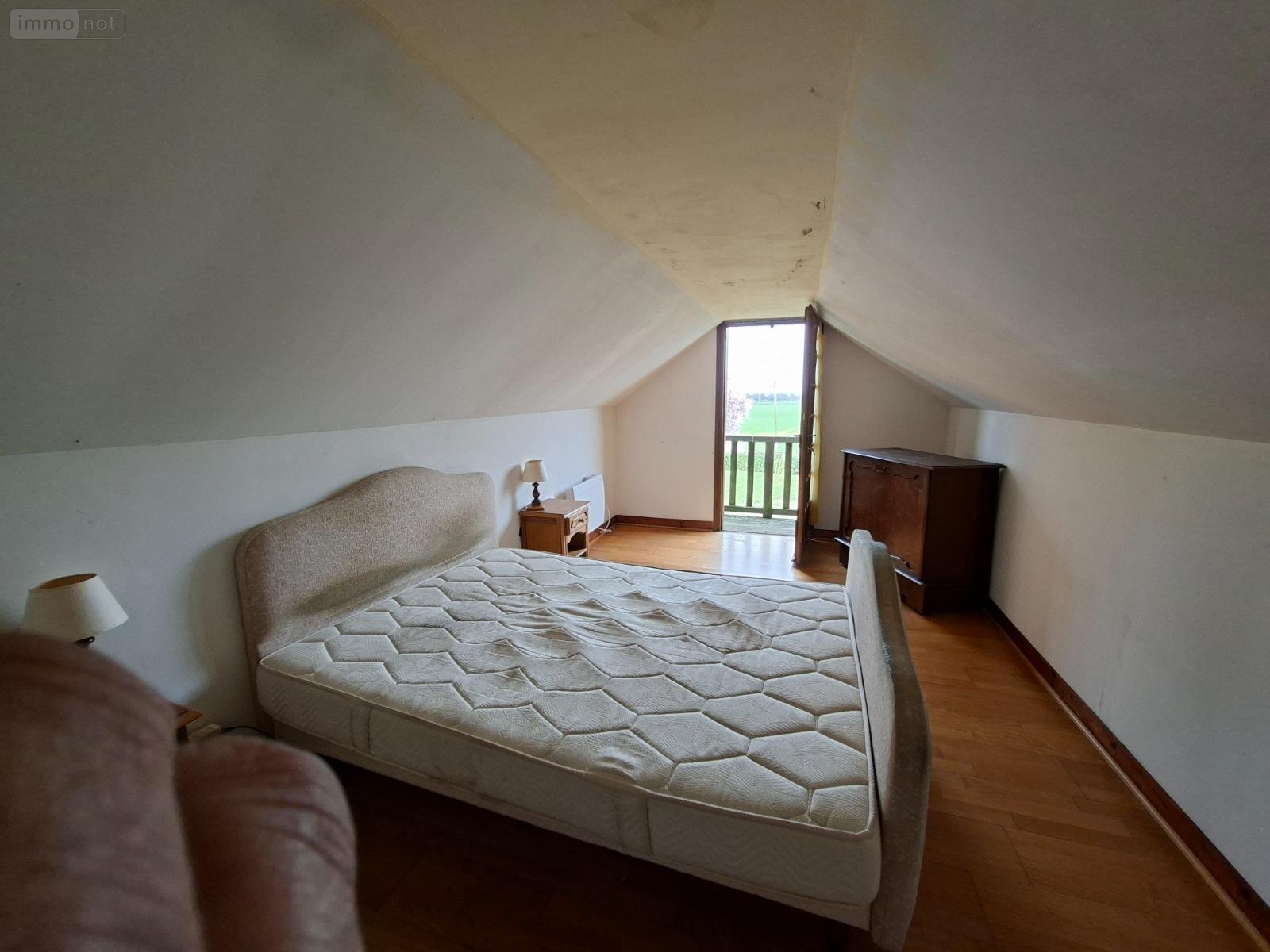 -au premier étage : palier avec lavabo, pièce mansardée, petite chambre.