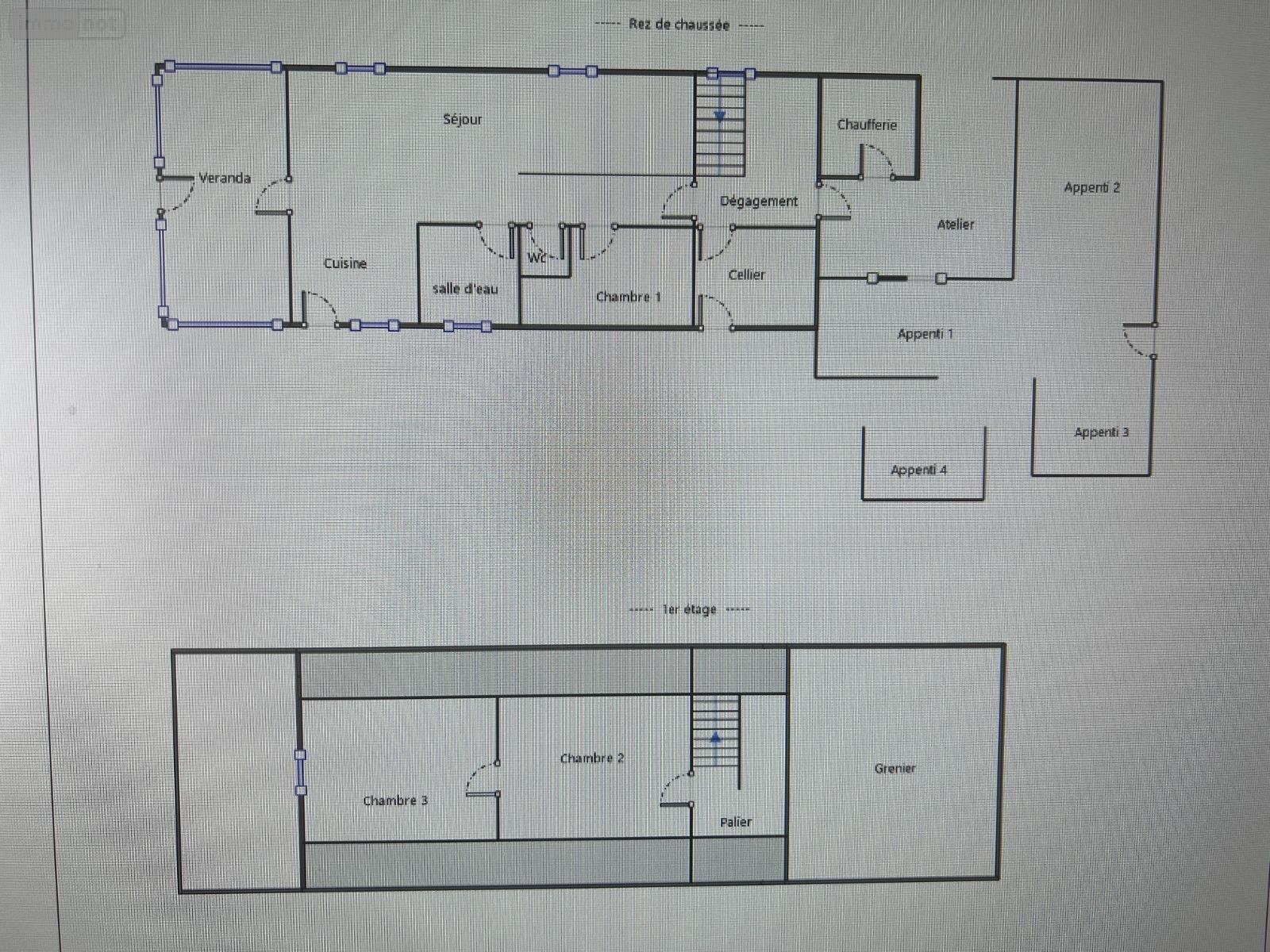 -au rez-de-chaussée : véranda 31 m2, salle avec cheminée à foyer ouvert, cuisine, couloir desservant salle d'eau, WC avec lave-mains, chambre, bureau, cellier, chaufferie.